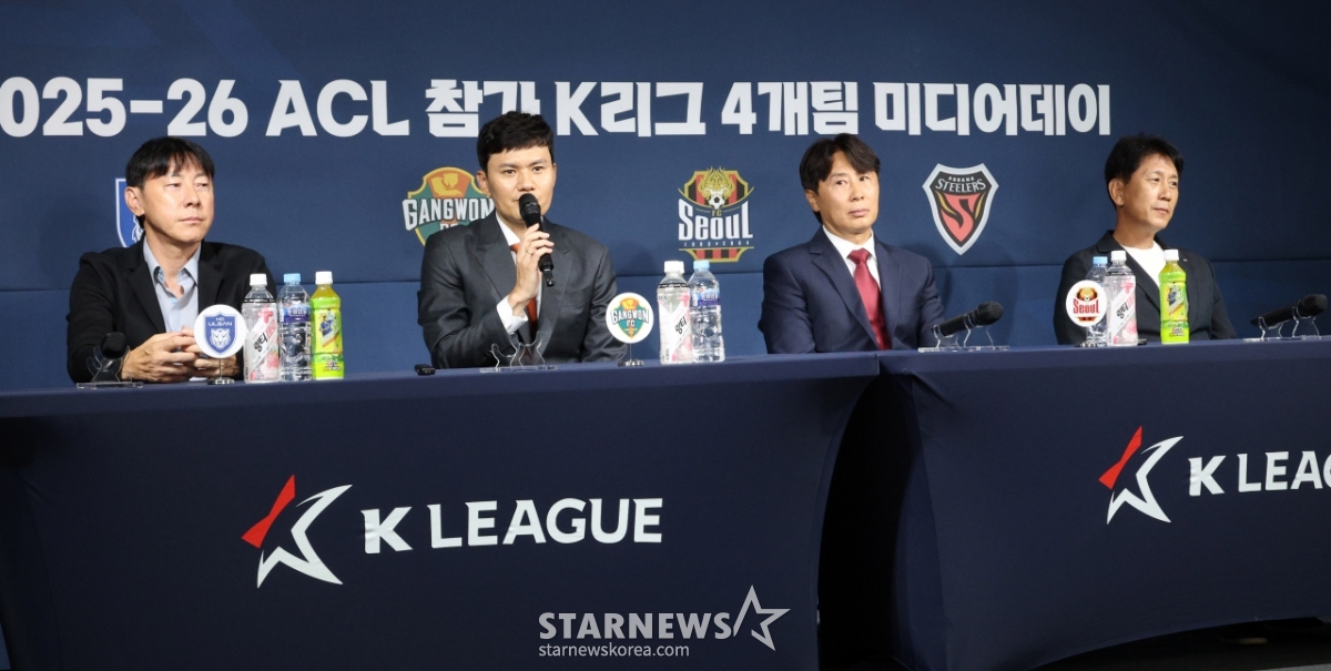 스포츠축구[포토] ACL 출사표 밝히는 K리그 사령탑발행 : 2025.09.04 ・ 10:27신문로=김진경 대기자'2025-26 ACL 참가 K리그 4개팀 미디어데이'가 4일 서울 신문로 축구회관 2층 다목적회의실에서 열렸다.신태용 울산 감독(왼쪽부터), 정경호 강원 감독, 김기동 FC서울 감독, 박태하 포항 감독이 출사표를 밝히고 있다.<저작권자 © 스타뉴스, 무단전재 및 재배포 금지>ACLAFCK리그미디어데이FC서울축구협회추천 기사김진경 대기자기자홈좋아요 스포츠-축구의 인기 급상승 뉴스스포츠-축구의 최신 뉴스
