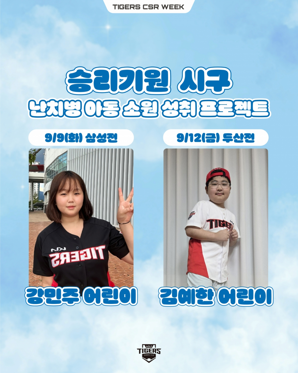 시구자로 초청된 강민주(14), 김예한(10) 학생은 각각 급성림프구성백혈병과 급성골수성백혈병이라는 희귀 난치병을 진단받고 투병 생활을 이어가고 있다. 두 학생은 모두 투병의 아픔을 겪고 있지만, 언제 어디서나 KIA 타이거즈 선수들을 열렬히 응원하는 찐팬이기도 하다.