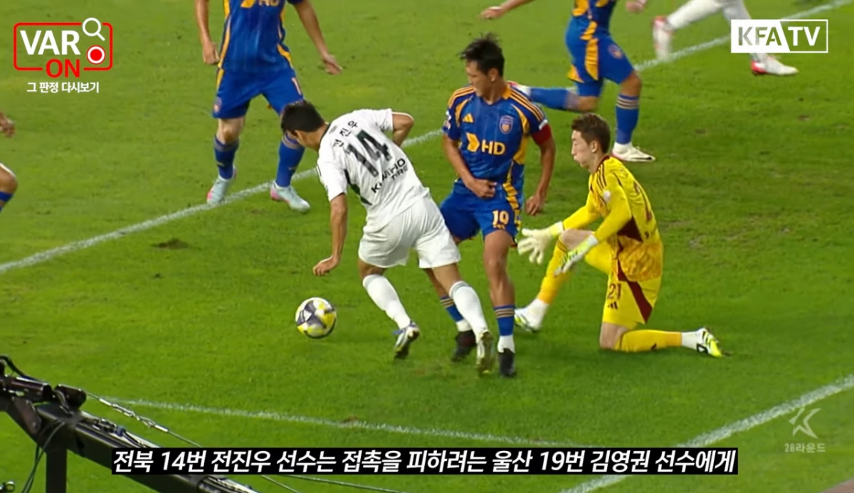 축구협회 심판위는 5일 협회 유튜브 'VAR ON, 그 판정 다시보기 EP.3' 콘텐츠를 통해 "전진우에게 경고 조치 후 울산의 간접프리킥으로 재개한 심판의 판정은 적절한 결정이었다"고 설명했다.