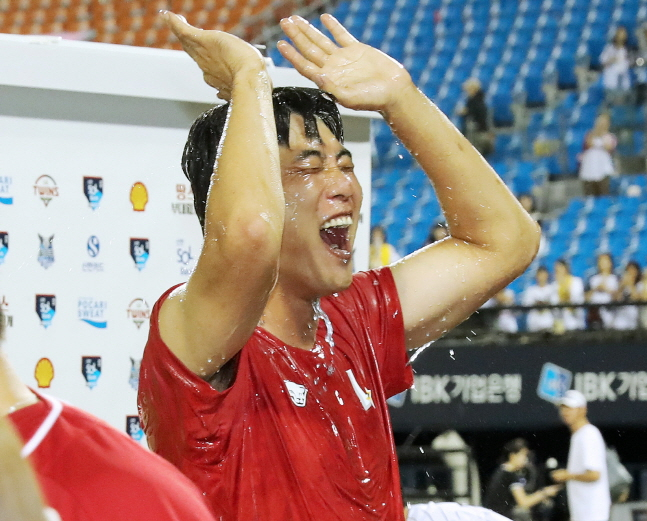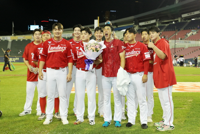 3회말 수비를 마치자 더그아웃으로 향하는 김광현에게 이숭용 감독이 직접 다가와 꽃다발을 선사하며 축하를 전했고 동료들과도 하나 하나 인사를 나누며 기쁨을 누렸다.