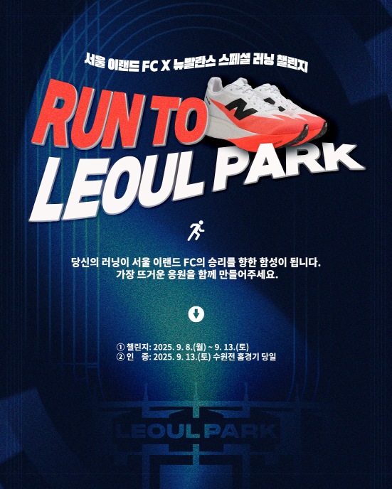 참가자는 서울 이랜드 공식 앱에서 이벤트를 신청한 후 수원전 홈경기 당일 뉴발란스 브랜드데이 부스를 방문해 GPS 기반 러닝 앱 기록을 인증하면 된다. 인증을 완료한 선착순 300명에게는 스페셜 메달과 하프타임 럭키드로우 응모권이 제공된다.