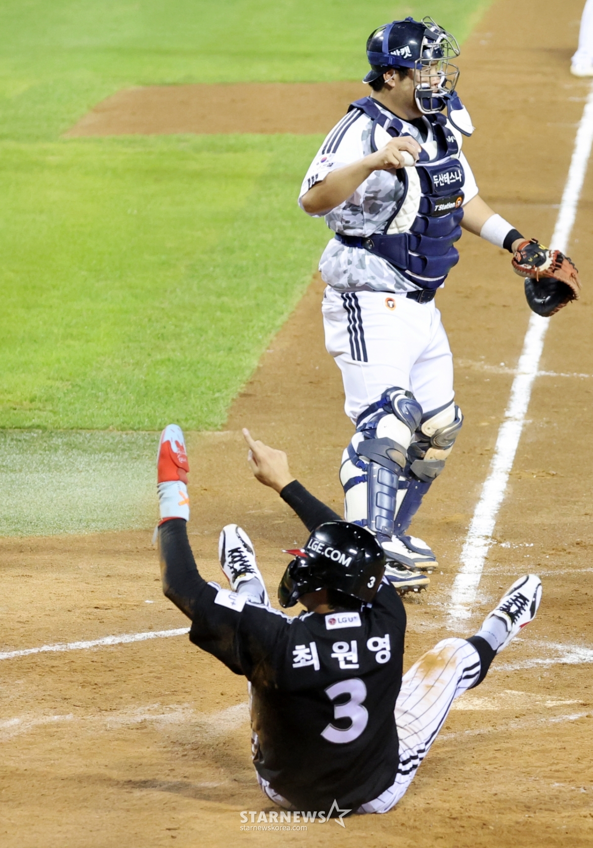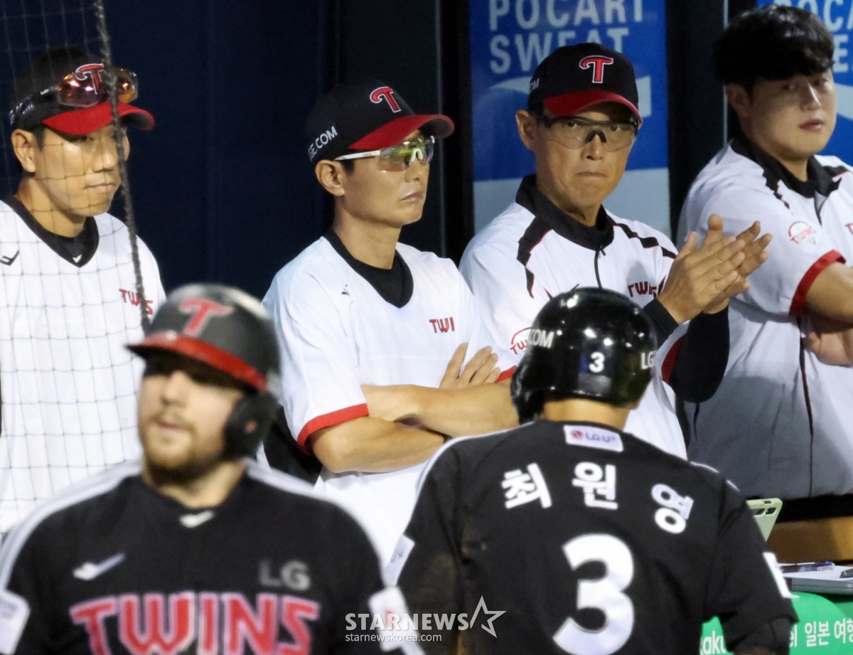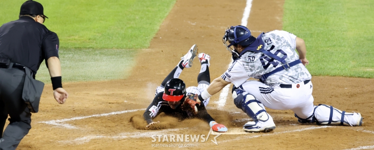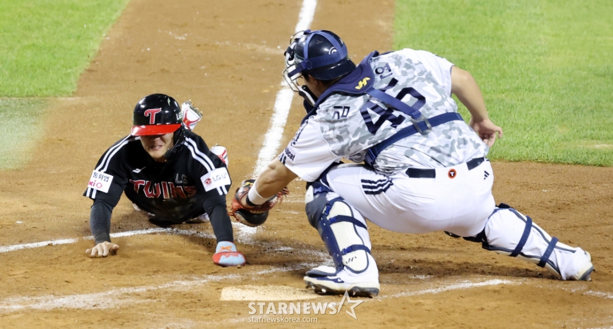 LG 8번타자 최원영이 10일 잠실구장에서 열리는 2025KBO리그 두산베어스와 LG트윈스 경기 5회초 무사 2,3루 신민재의 좌익선상 외야플라이때 3루에서 홈으로 뛰어 아웃이 됐다. 최원영은 확신에 찬 듯 염경엽 감독을 향해 네모박스를 그리며 비디오판독을 요청했다.
