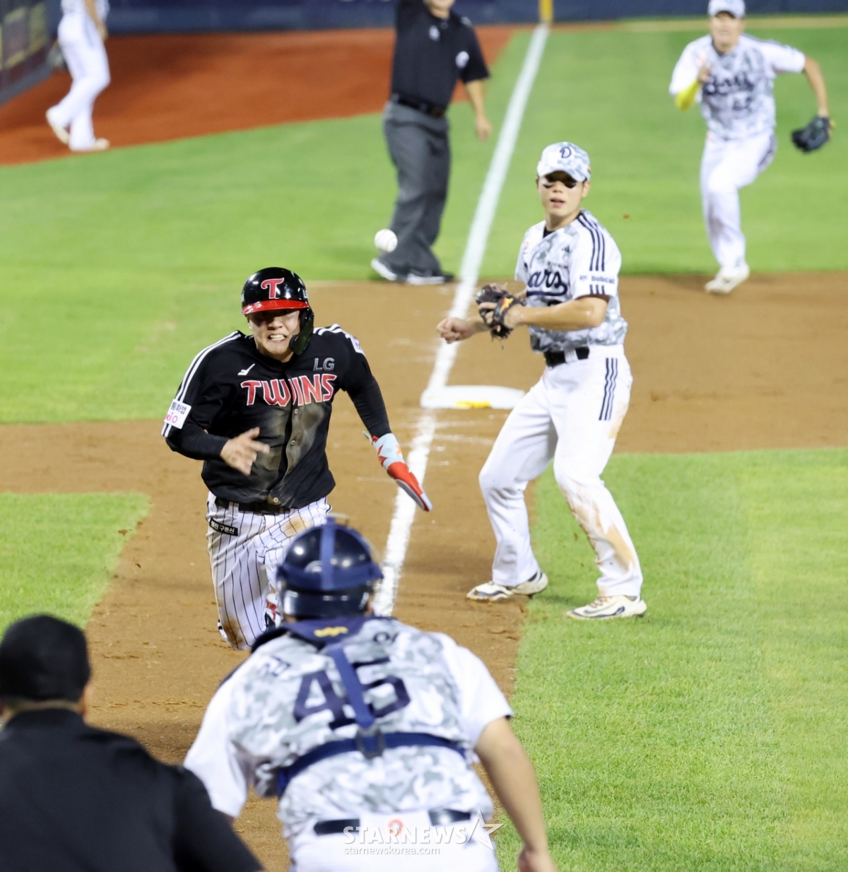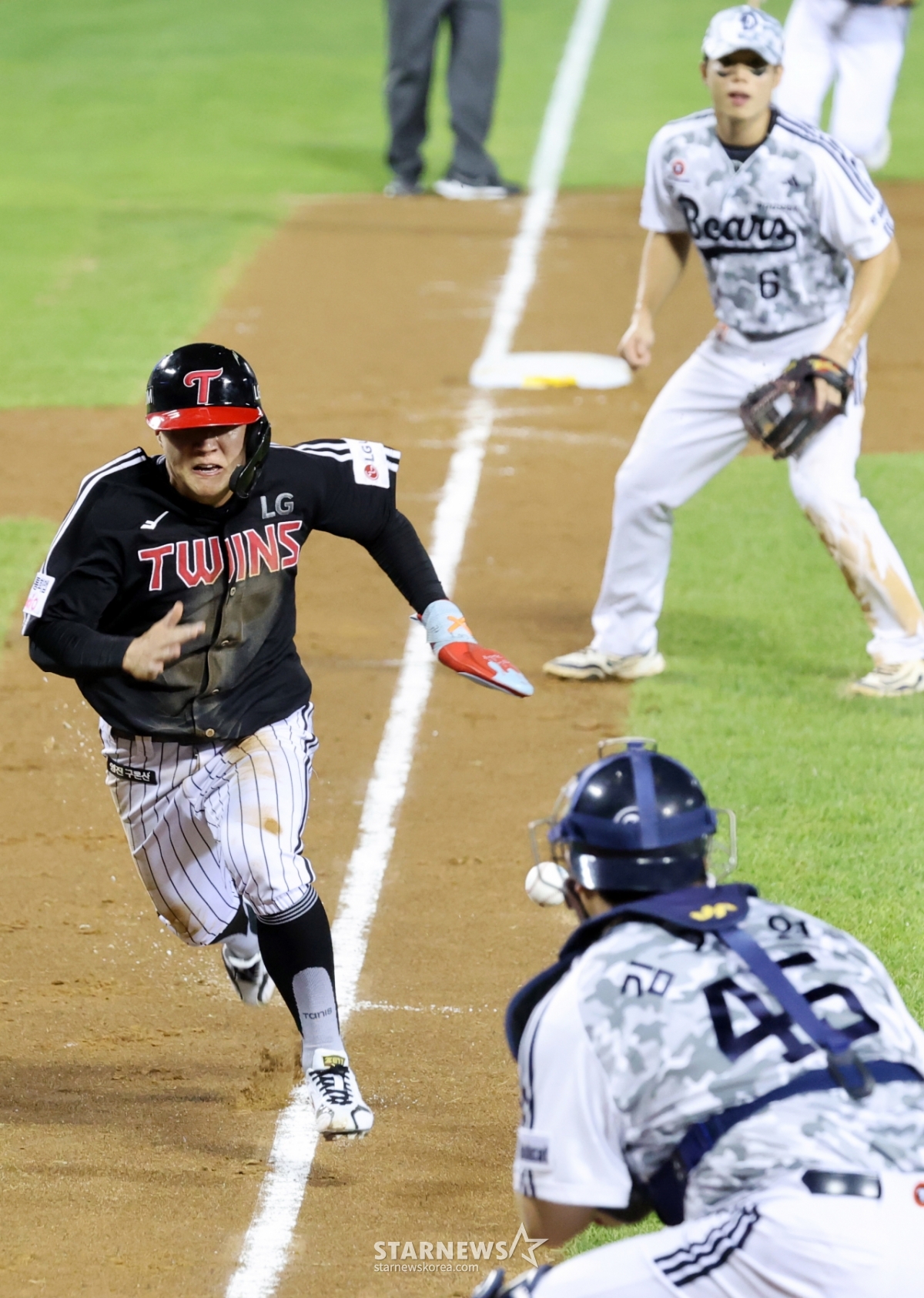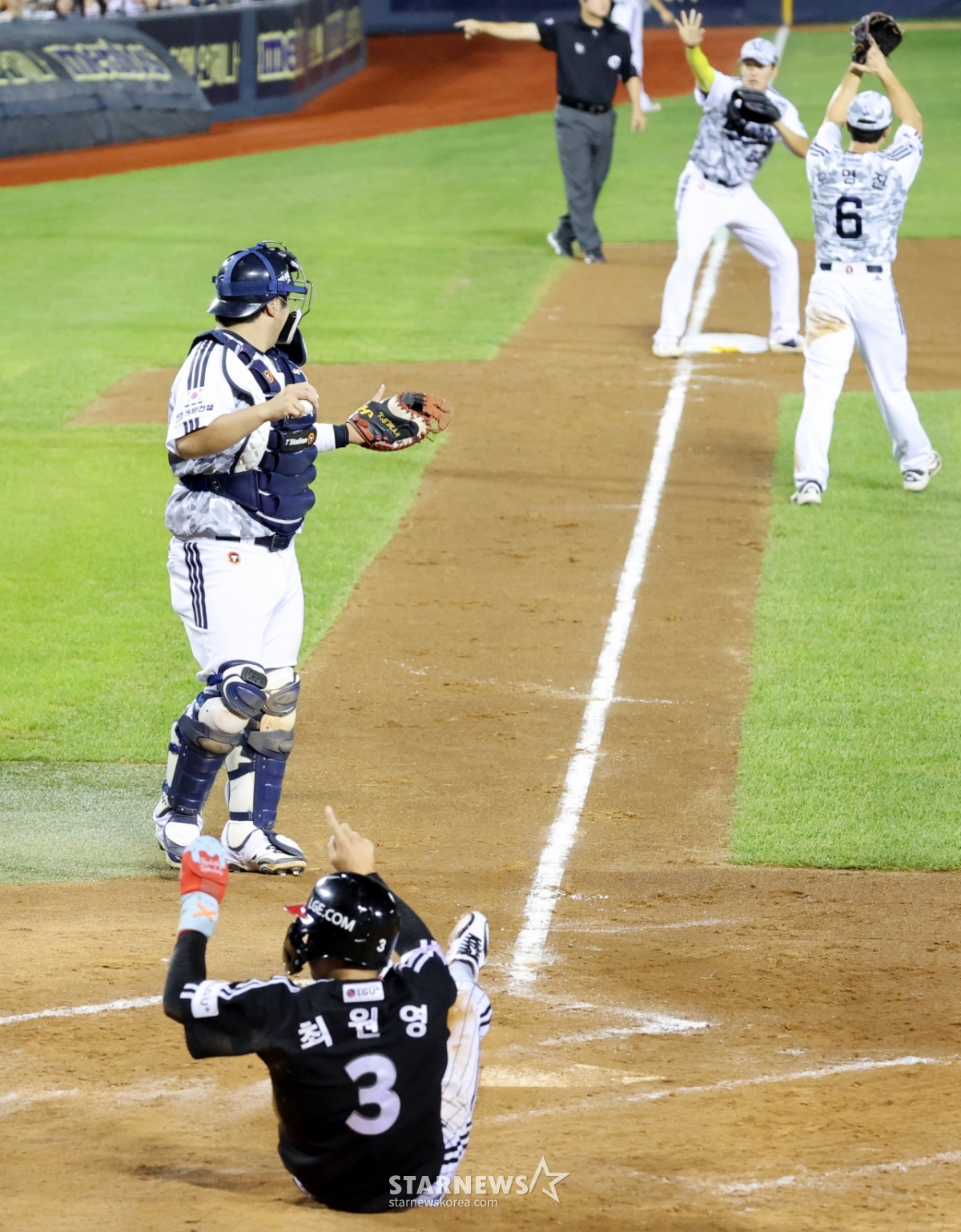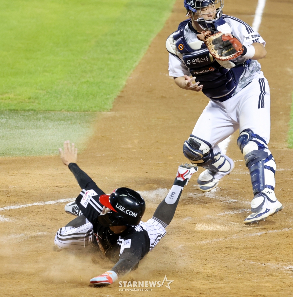 LG 8번타자 최원영이 10일 잠실구장에서 열리는 2025KBO리그 두산베어스와 LG트윈스 경기 5회초 무사 2,3루 신민재의 좌익선상 외야플라이때 3루에서 홈으로 뛰어 아웃이 됐다. 최원영은 확신에 찬 듯 염경엽 감독을 향해 네모박스를 그리며 비디오판독을 요청했다.