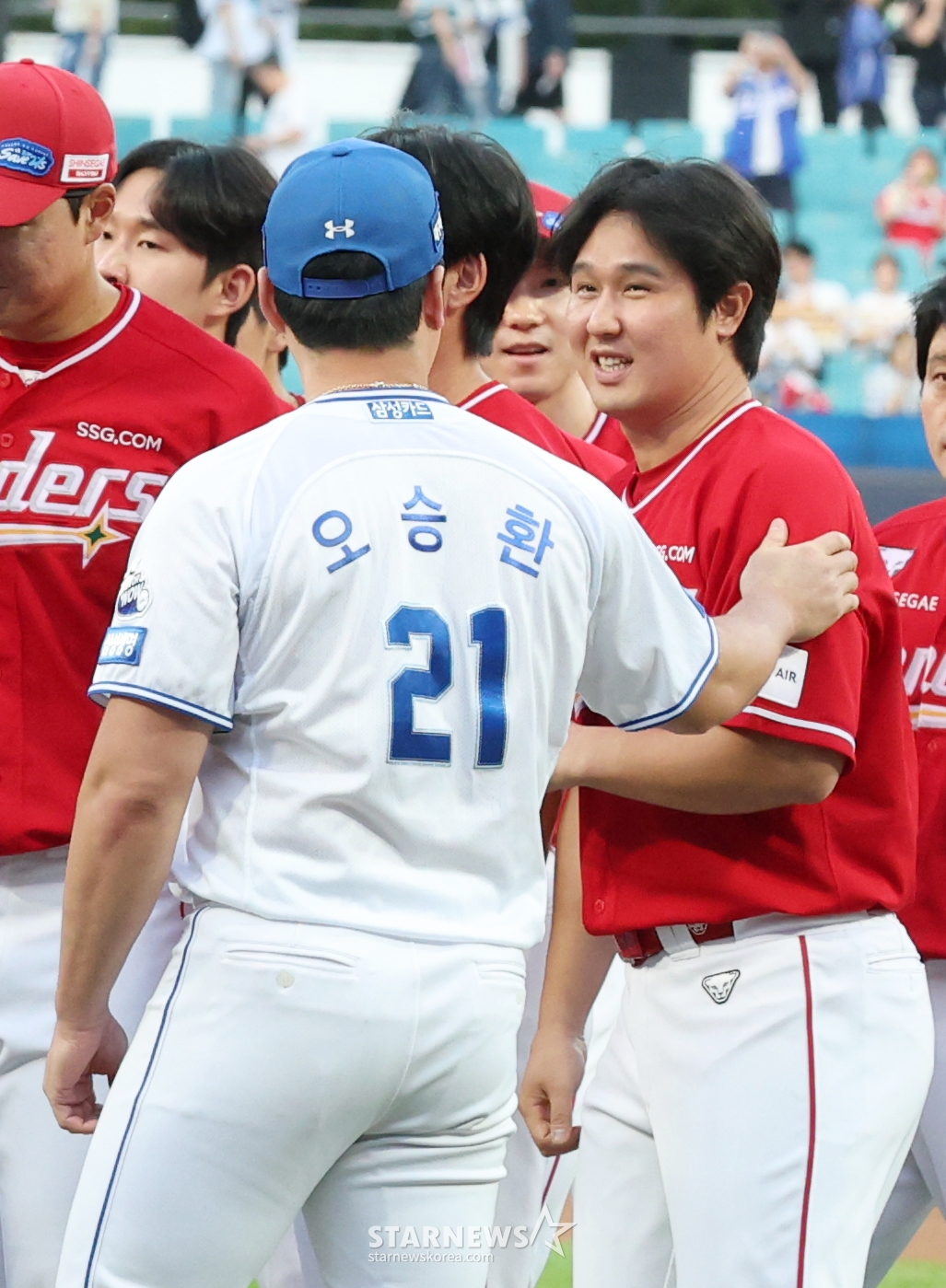 스포츠야구[포토] 오승환-최정 '레전드의 눈맞춤'발행 : 2025.09.11 ・ 18:50대구=김진경 대기자2025 신한 SOL Bank KBO리그 삼성 라이온즈 대 SSG 랜더스 경기가 11일 대구삼성라이온즈파크에서 열렸다.경기에 앞서 삼성 오승환 은퇴 투어 행사가 진행됐다.오승환이 행사 후 SSG 최정과 인사하고 있다.이번 시즌을 끝으로 현역 생활을 마무리하는 오승환은 상대 팀 선수들과 작별 인사를 하는 은퇴 투어를 진행 중이다.<저작권자 © 스타뉴스, 무단전재 및 재배포 금지>프로야구KBO우취구자욱박지만_감독이숭용_감독추천 기사김진경 대기자기자홈좋아요 스포츠-야구의 인기 급상승 뉴스스포츠-야구의 최신 뉴스