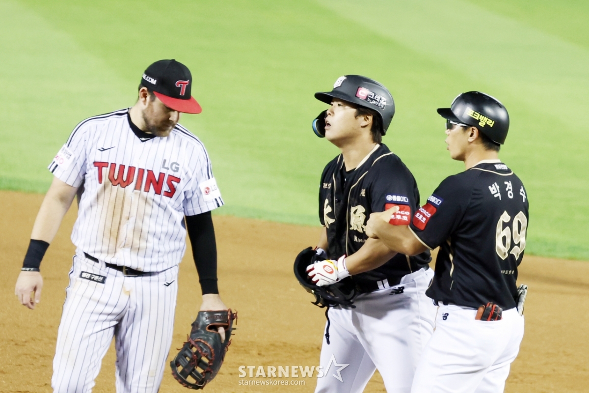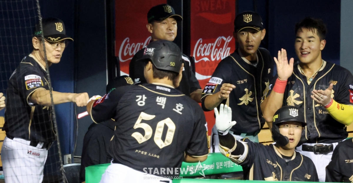 KT 강백호가 11일 잠실구장에서 열리는 2025KBO리그 KT위즈와 LG트윈스 경기 7회초 무사 1,2루에서 김상수 대타로 나서 1타점 적시타로 출루한후 교체되고 있다. 2025.09.11.