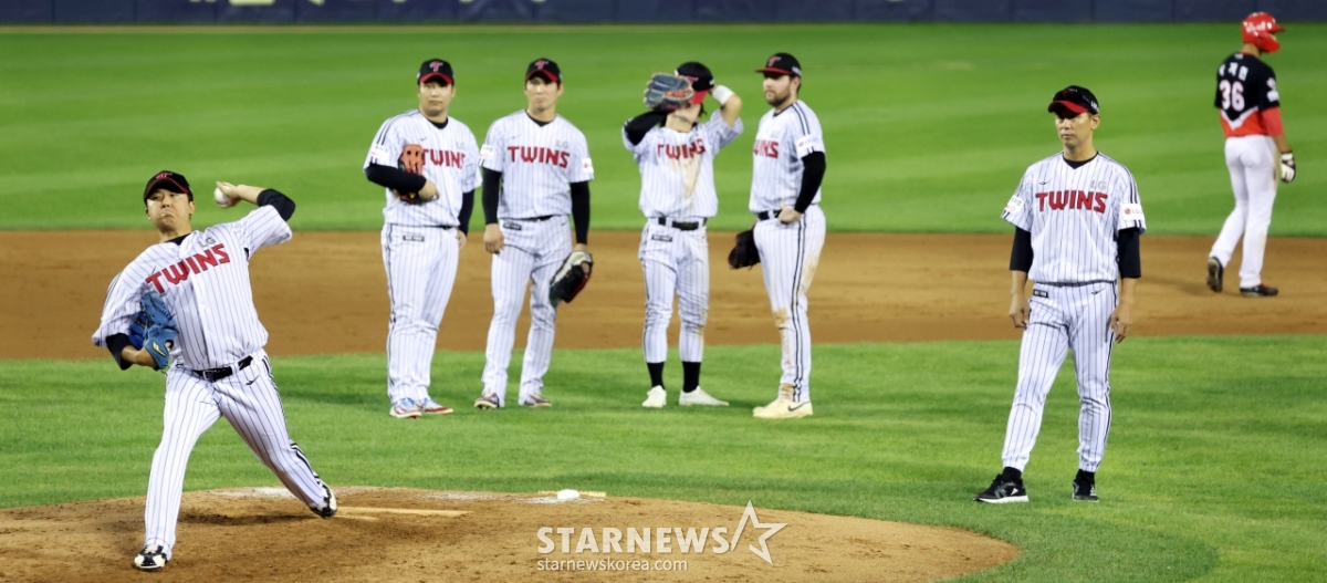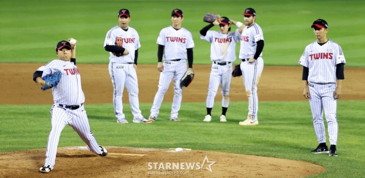 LG 좌완투수 송승기가 13일 잠실구장에서 열리는 2025KBO리그 LG트윈스와 KIA타이거즈 경기 8회초 김영우에 이어 등판하고 있다. 연습투구를 지켜보는 내야수들. 2025. 09.13.