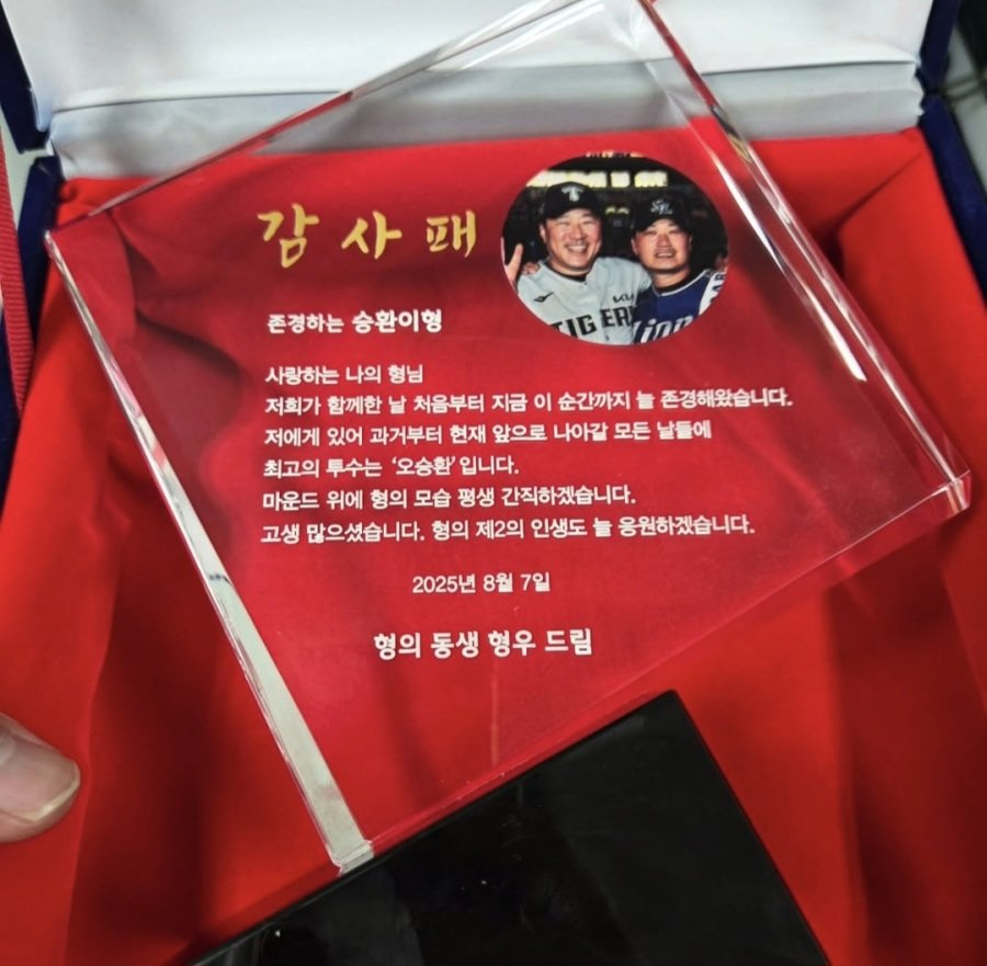국내 야구팬들도 울컥하게끔 하는 광경이었다. 최형우(42·KIA 타이거즈)의 진심 어린 선물과 메시지에 오승환(43·삼성 라이온즈)도 감동했다. 오승환도 직접 본인의 SNS에 최형우에 선물에 감사 인사를 남겼다.