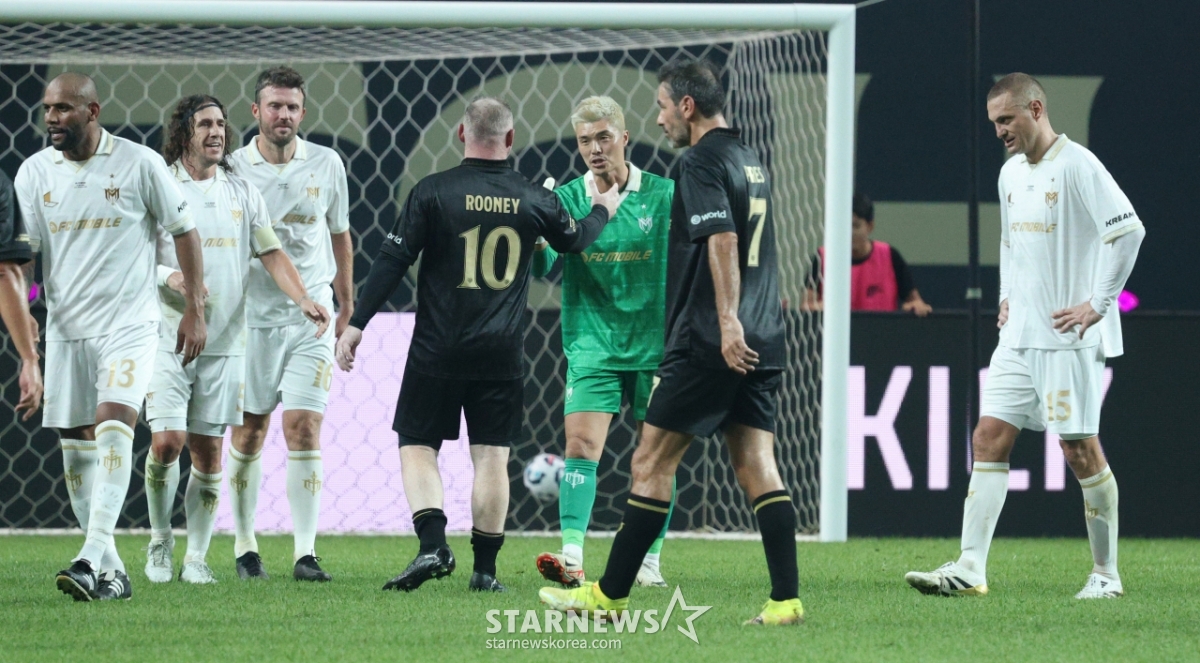 FC 스피어 루니가 경기 종료 휘슬이 울리자 실드 유나이티드 김영광과 인사하고 있다.