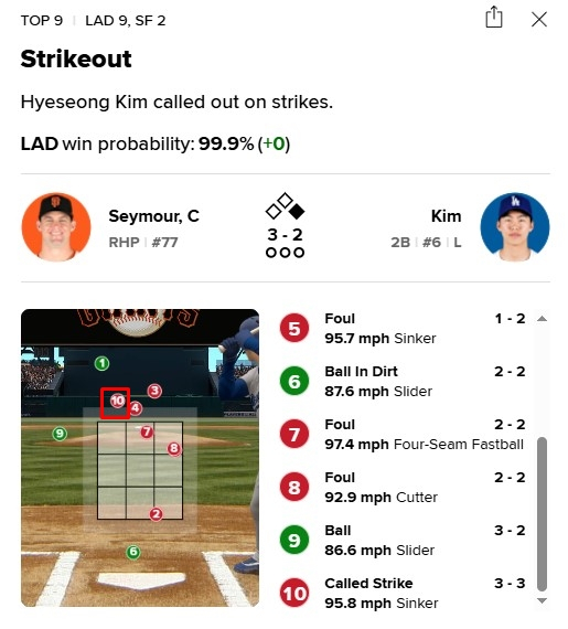 8회말 수비를 잘 마친 김혜성은 9회초 1사 1루 상황에서 첫 타석을 맞았다. 상대 투수는 카슨 시모어였다. 초구 볼을 잘 골라낸 김혜성은 연속 4구를 커트하며 끈질기게 잘 버텼다. 9구까지 볼을 추가로 2개 더 참아낸 김혜성은 시모어가 던진 10구 높은 싱커에 방망이를 잘 참았으나 심판이 스트라이크 선언을 하며 삼진을 당하고 말았다. 육안 상으로도 다소 높은 공이었기에 김혜성에게 다소 아쉬운 판정이었다.