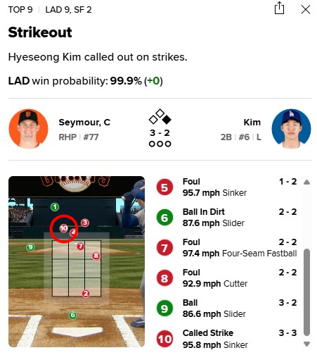 8회말 무키 베츠의 대수비로 투입돼 2루수로 나선 김혜성은 9회초 타석에 올랐으나 10구까지 가는 긴 승부 끝에 루킹 삼진으로 물러났다. MLB 게임데이상으로는 분명히 존을 벗어난 공이었으나 억울하게 삼진을 당했다. 시즌 타율은 0.283으로 내려갔다.