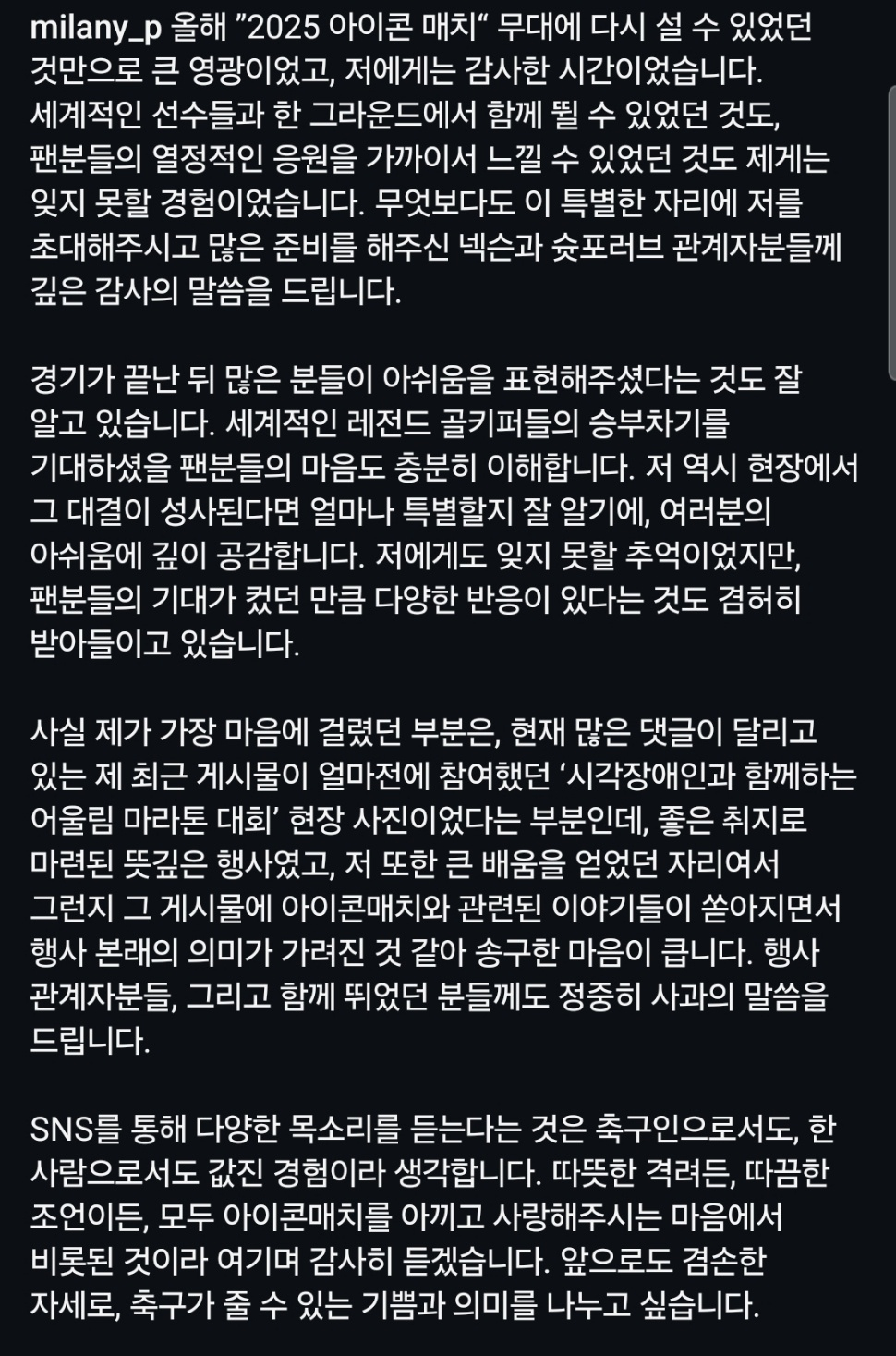 더불어 박주호는 이번 행사에 초청한 주최 측과 동료 선수들에게도 감사 인사를 전했다. 박주호는 "초대해 주신 관계자분들께 깊이 감사드린다. 실드팀 선배들과 베니테스 감독님께서 존중해 주신 덕분에 그라운드 안에서 더 값진 시간을 보낼 수 있었다"며 "따뜻한 격려든, 따끔한 조언이든 모두 아이콘 매치를 아끼는 마음에서 나온 것으로 알겠다. 겸손하게 듣고, 축구가 줄 수 있는 기쁨과 의미를 계속 나누고 싶다"고 했다.