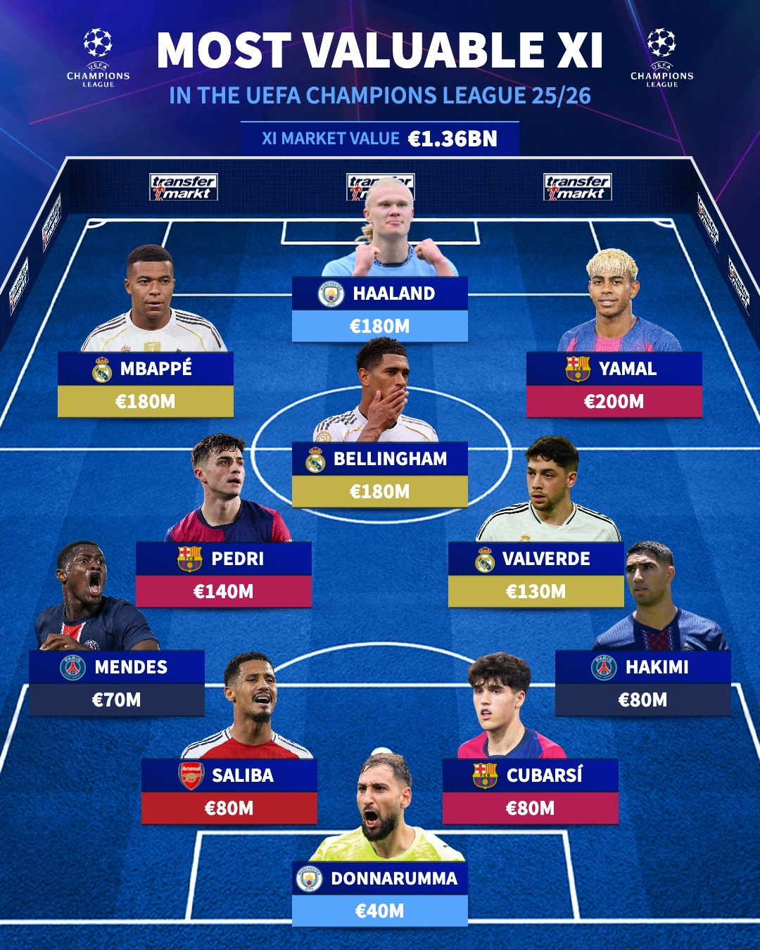 축구 이적 전문 사이트 트랜스퍼마르크트는 16일(한국시간) 2025~2026시즌 UCL에 참가하는 선수들 가운데 포지션별 시장가치 1위 선수들로 베스트11을 구성해 공개했다.