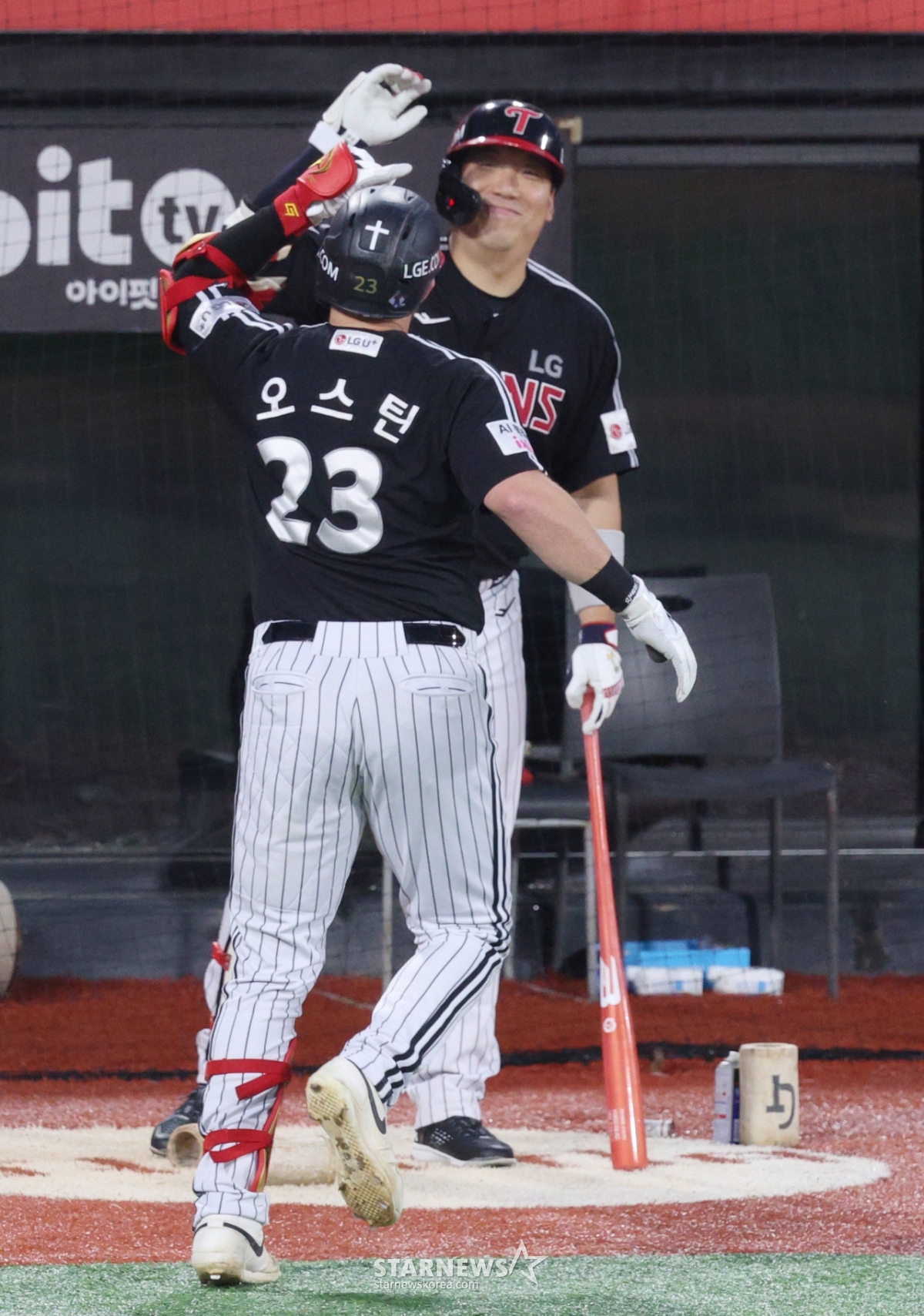 스포츠야구[포토] 오스틴 '김현수와 미소 교환'발행 : 2025.09.16 ・ 18:56수원=김진경 대기자2025 신한 SOL Bank KBO리그 KT 위즈 대 LG 트윈스 경기가 16일 수원 KT위즈파크에서 열렸다.LG 오스틴이 1회초 2사에서 선제 중월 1점 홈런을 날리고 홈인한 후 김현수의 환영을 받고 있다.<저작권자 © 스타뉴스, 무단전재 및 재배포 금지>프로야구KBO헤이수스손주영미스코리아시구추천 기사김진경 대기자기자홈좋아요 스포츠-야구의 인기 급상승 뉴스스포츠-야구의 최신 뉴스