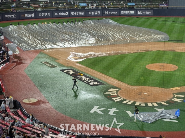 퍼붓던 비는 약 1시간 뒤인 오후 8시 20분 무렵부터 조금씩 잦아들기 시작했다. 하지만 그 1시간 동안 쏟아진 엄청난 비에 방수포를 걷었음에도 유격수와 3루 사이 그라운드가 흥건하게 젖었다. 결국 그라운드 정비에 조금 더 시간이 필요해졌다.