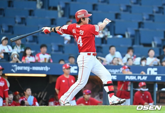 최정은 16일 창원 NC파크에서 열린 NC와 2025 신한 SOL뱅크 KBO리그 방문경기에서 멀티 홈런을 터뜨리며 5타수 3안타 3타점 2득점 맹타를 휘두르며 팀에 7-3 승리를 안겼다.