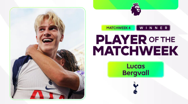 잉글랜드 프리미어리그(EPL) 사무국은 17일(한국시간) "베리발이 팬 투표에서 27%의 지지를 얻어 EPL 4라운드 최우수 선수로 뽑혔다"고 발표했다. 베리발은 히샬리송, 주앙 팔리냐에 이어 올 시즌 토트넘 선수로는 세 번째 수상자가 됐다.