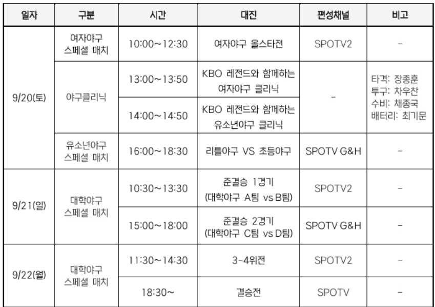 행사 첫날인 20일에는 유소년 및 여자야구 올스타전과 함께 야구클리닉이 진행된다. 클리닉에는 KBO 레전드 장종훈, 차우찬, 채종국, 최기문이 참여해 포지션별 집중 코칭을 통해 기본기 강화와 기량 향상을 지원한다. 여자야구 올스타전은 오전 10시 SPOTV2, 리틀야구 올스타와 초등야구 올스타가 맞붙는 유소년야구 올스타전은 오후 4시 SPOTV G&H에서 중계된다.
