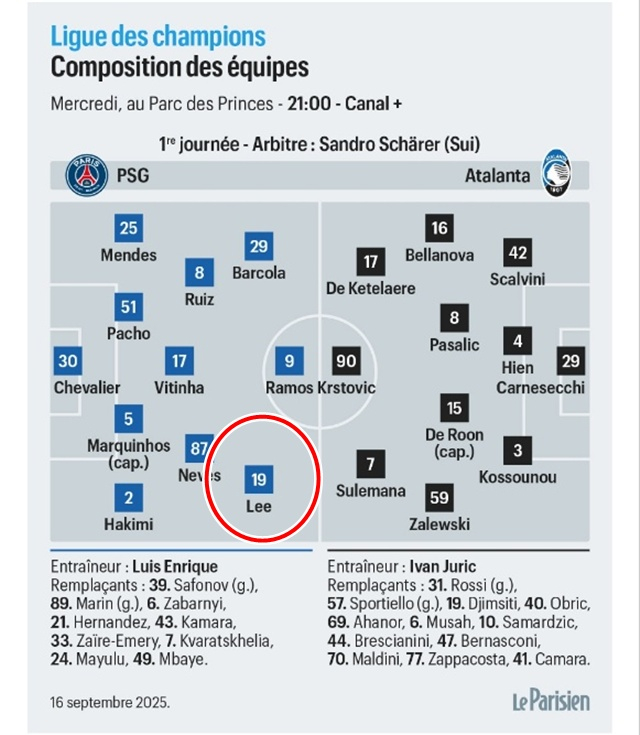 프랑스 르 파리지앵은 "크바라츠헬리아의 출전 여부는 여전히 불투명하다"면서 "루이스 엔리케 PSG 감독은 지난 시즌 부진했던 UCL 출발을 반복하지 않으려고 한다. 비교적 평범한 선발 명단을 펼칠 것으로 예상한다. 전력이 크게 약화된 공격진은 브래들리 바르콜라가 왼쪽에 서고, 곤살루 하무스가 최전방 공격수를 차지할 것이다. 스리톱의 마지막은 지난 경기에서 발목을 다쳤으나, 코치진의 판단에 따라 이강인이 맡을 것으로 보인다"고 내다봤다.