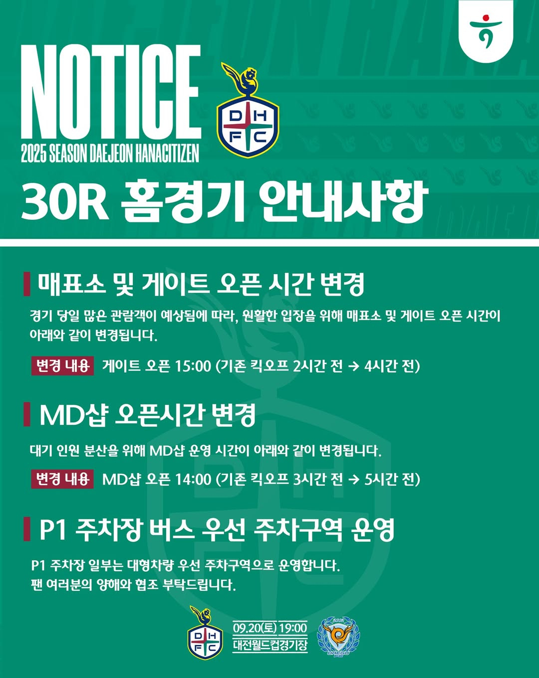 대전 구단 역시도 '임영웅 효과'에 따른 구름 관중에 대비하고 있다. 이미 경기 당일 운영 시간부터 앞당긴다. 구단에 따르면 킥오프 2시간 전에 오픈하던 매표소나 게이트는 2시간이 앞당겨 오후 3시부터 오픈한다. MD샵 오픈시간 역시 2시간을 앞당겨 오후 2시에 문을 열 예정이다. 많은 팬들이 몰릴 것에 대비해 입장 대기 시간을 줄이고, 팬들이 화장실 등 편의시설 이용에도 불편함이 없도록 하기 위해서다. 단체 버스를 이용하는 팬들을 위해서도 경기 당일 P1 주차장 일부는 대형차량 우선 주차구역으로 운영할 예정이다.