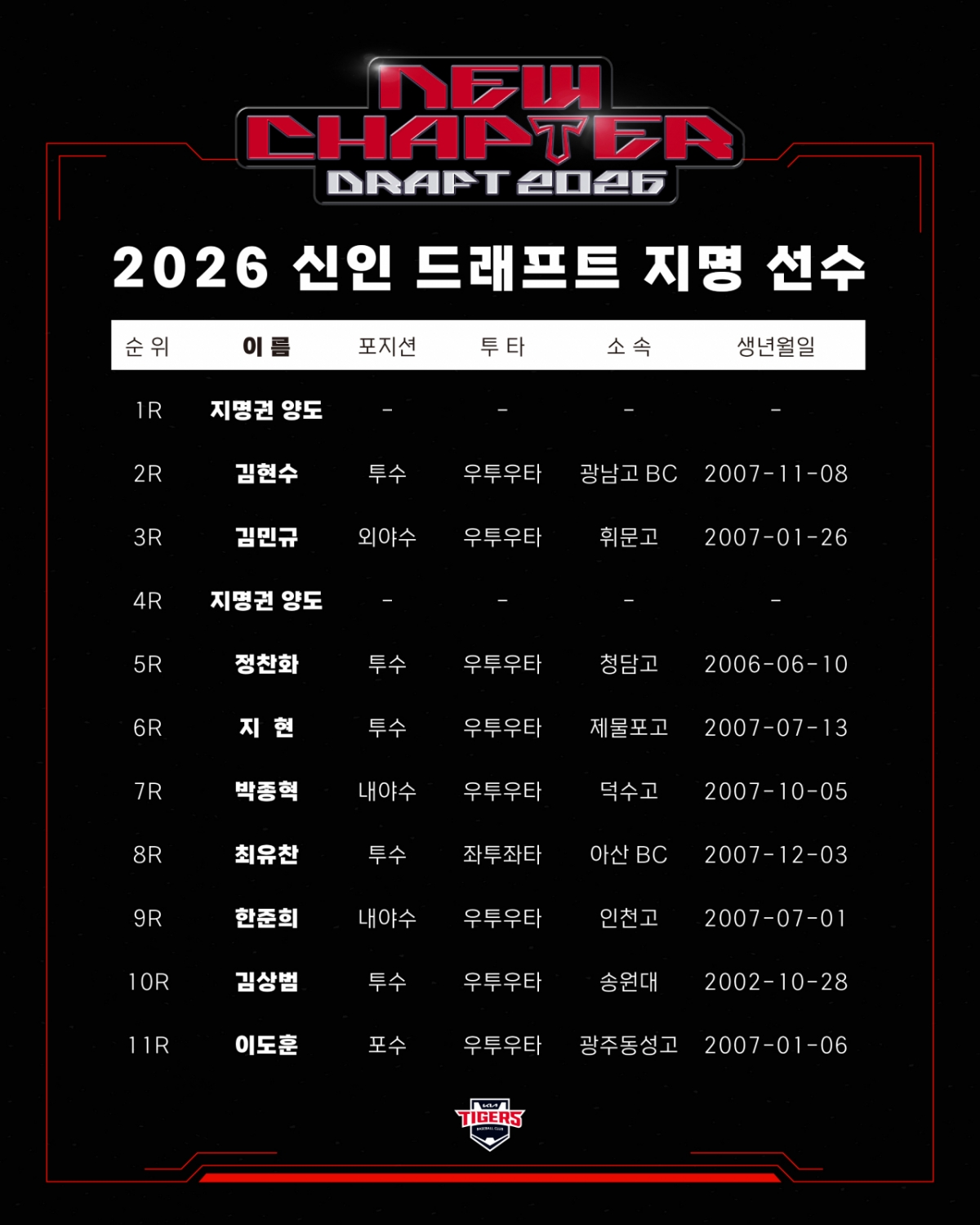 KIA 타이거즈는 17일 오후 2시 서울 롯데호텔 월드 크리스탈볼룸에서 열린 '2026 KBO 신인 드래프트' 2라운드에서 김현수(광남고BC. 투수)를 지명하는 등 총 9명의 선수를 뽑았다.