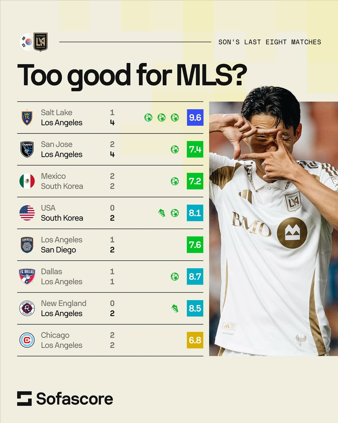 손흥민(33·로스앤젤레스FC)의 미국 프로축구 메이저리그사커(MLS) 입성 초반 활약이 리오넬 메시(38·인터 마이애미)와 비교해도 손색이 없다는 현지 매체 극찬이 나왔다.