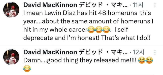 지난해 삼성 유니폼을 입고 뛰었던 데이비드 맥키넌(31)도 감탄을 감추지 못했다. 맥키넌은 자신의 X(구 트위터)를 통해 "디아즈가 올해에만 48홈런을 쳤는데 내 통산 홈런과 비슷하다"며 "자기비하지만 나는 솔직하다. 나는 이런 사람이야"라고 말했다.