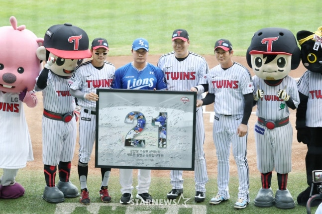 LG 구단과 선수단은 오승환의 뒷모습과 잠실야구장을 형상화해 디자인한 목각 기념패와 LG 선수단 메시지 및 사인 대형 액자를 오승환에게 선물했다. 목각 기념패에는 그의 등장곡과 떼창이 내장돼 있어 의미를 더했다.