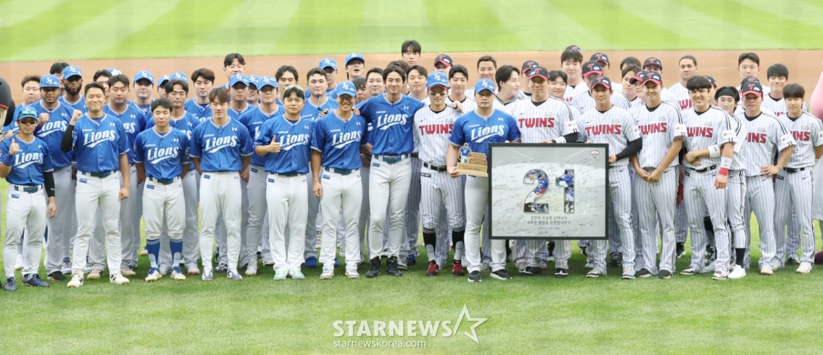 스포츠야구[포토] 끝판대장을 보내는 LG의 심정발행 : 2025.09.20 ・ 16:48잠실=김진경 대기자2025 신한 SOL Bank KBO리그 LG 트윈스 대 삼성 라이온즈 경기가 20일 서울 잠실야구장에서 열렸다.삼성 오승환 은퇴 투어 행사가 경기에 앞서 진행됐다.LG와 삼성 선수들이 오승환을 중심으로 기념촬영을 하고 있다.이번 시즌을 끝으로 현역 생활을 마무리하는 오승환은 앞으로 원정 경기에서 상대 팀 팬들과 선수들을 상대로 작별 인사를 하는 은퇴 투어를 진행 중이다.<저작권자 © 스타뉴스, 무단전재 및 재배포 금지>브리핑요약 없이도 가볍게 읽으실 수 있는 짧은 뉴스입니다.추천 기사김진경 대기자기자홈좋아요스포츠-야구의 인기 급상승 뉴스스포츠-야구의 최신 뉴스AD