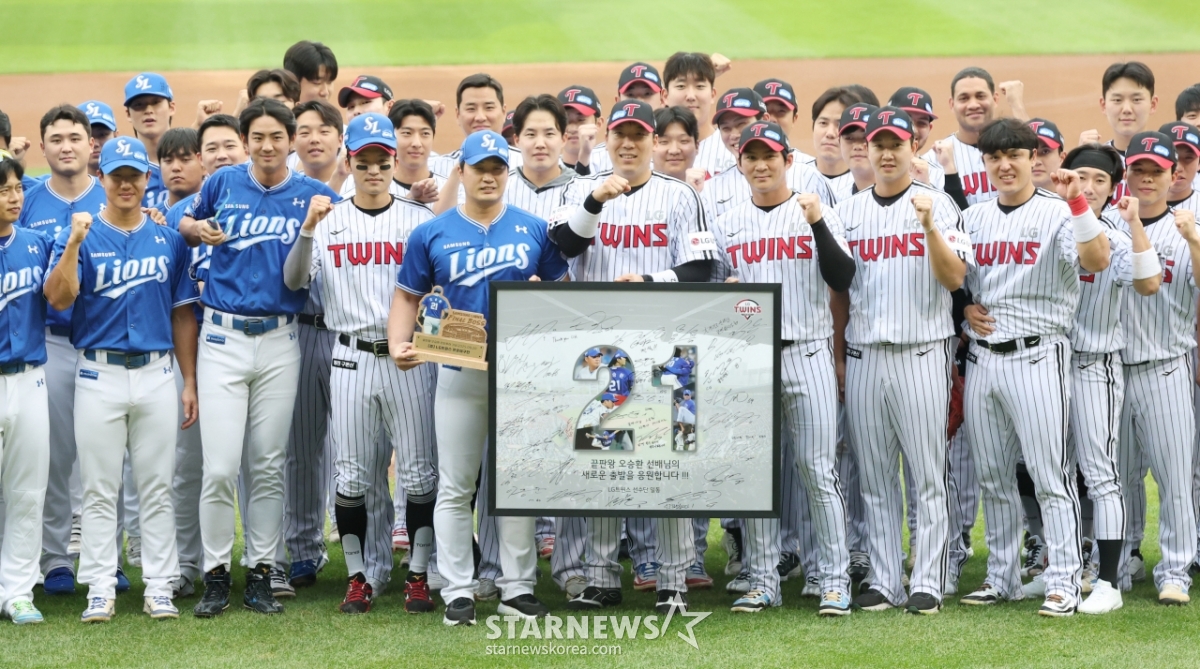LG와 삼성 선수들이 오승환을 중심으로 기념촬영을 하고 있다.