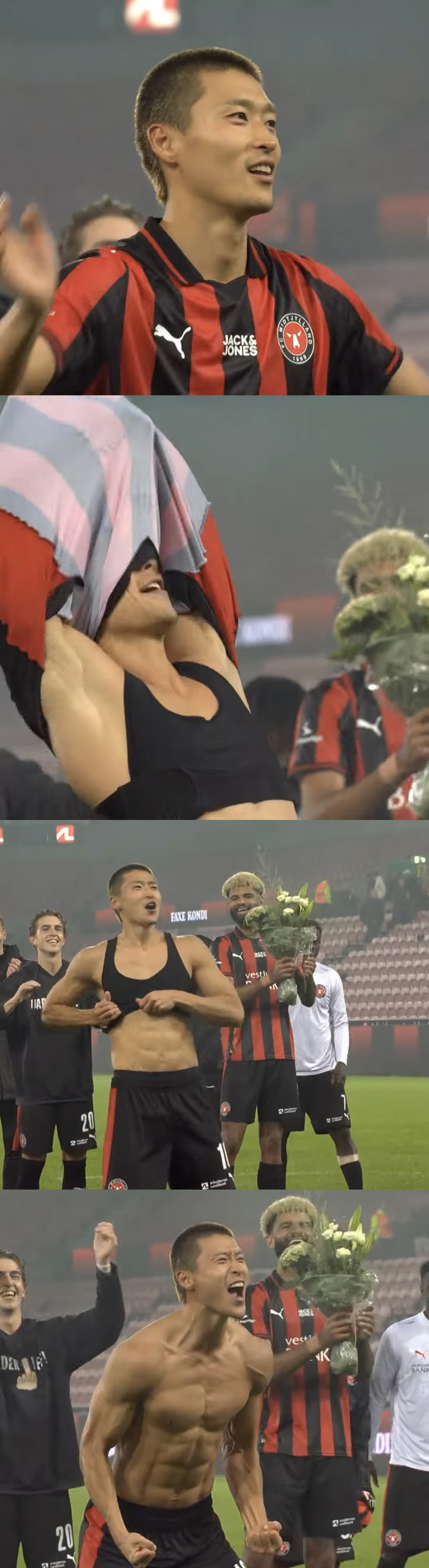 조규성(27)의 '탈의 세리머니'에 미트윌란 팬들이 열광했다.