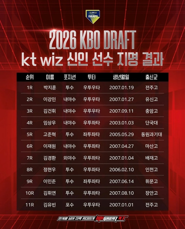 그런 가운데 지난 17일 열린 2026 KBO 신인드래프트는 포스트 강백호 시대를 대비할 몇 안 되는 기회였다. 대체로 잠재력 높은 미래 자원과 즉시 전력감을 모두 챙겼다는 평가다. KT 구단은 드래프트 직후 "결과에 만족한다. 당초 계획했던 대로 1라운드에 전주고 투수 박지훈을 지명했고, 상위 라운드에서 내야수를 보강했다. 전체적으로 팀 구성 및 미래 가치를 보고 선수들을 지명했다"고 총평했다.