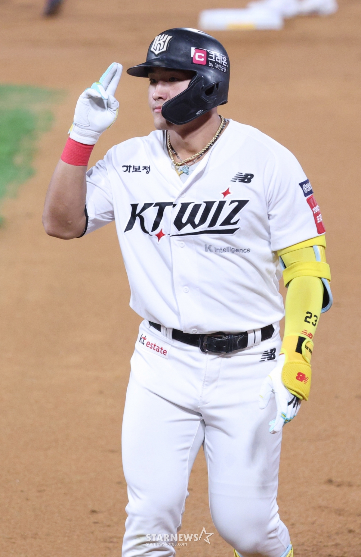 스포츠야구[포토] 안현민 '1회 미션 클리어'발행 : 2025.09.23 ・ 19:13수원=김진경 대기자2025 신한 SOL Bank KBO리그 KT 위즈 대 키움 히어로즈 경기가 23일 수원 KT위즈파크에서 열렸다.KT 안현민이 1회말 1사 1루에서 좌전 안타를 날리고 출루한 후 세리머니를 하고 있다.<저작권자 © 스타뉴스, 무단전재 및 재배포 금지>프로야구KBO시구승요승리요정오원석추천 기사김진경 대기자기자홈좋아요 스포츠-야구의 인기 급상승 뉴스스포츠-야구의 최신 뉴스