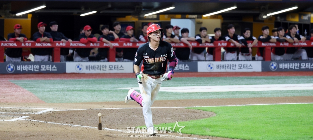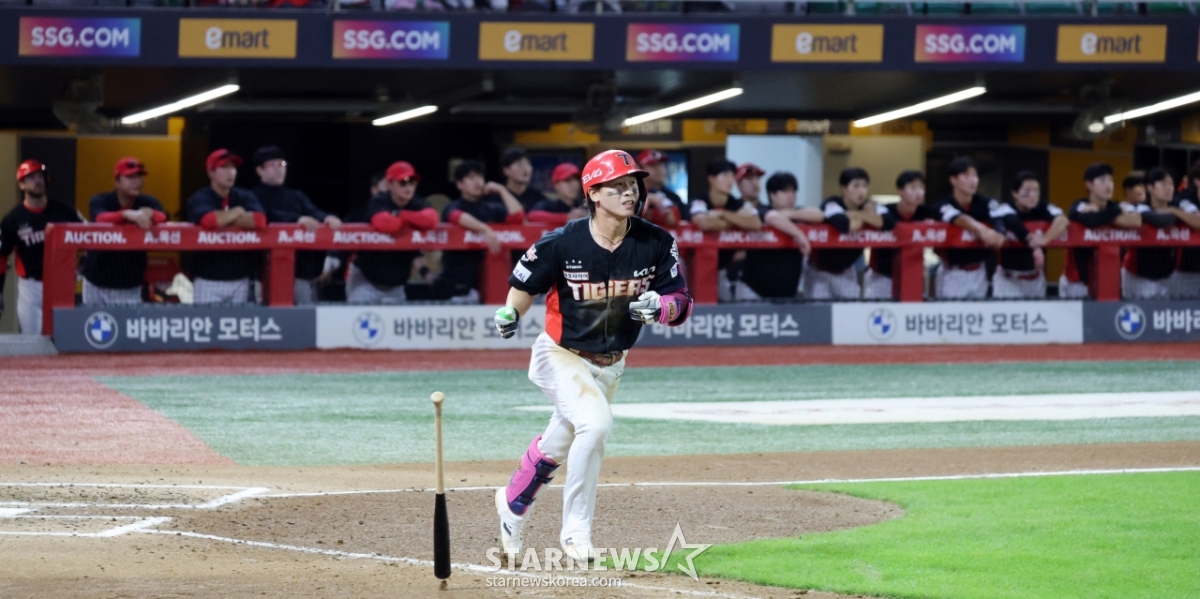 기아 2번타자 박찬호가 23일 인천 SSG랜더스필드에서 열린 2025KBO리그 KIA타이거즈와 SSG랜더스 경기 6회초 2사 2루에서 외야플라이로 물러나며 아쉬워하고 있다. 2025.09.23.