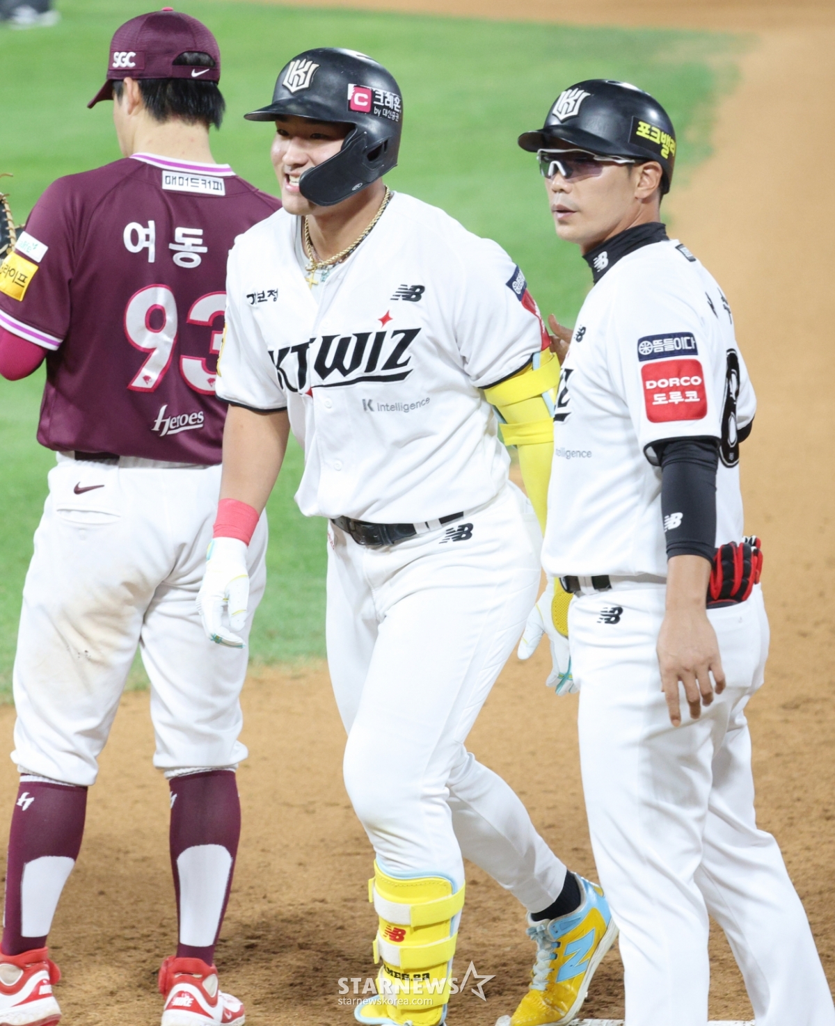스포츠야구[포토] 안현민, 쐐기타 날리고 대주자와 바통 터치발행 : 2025.09.23 ・ 20:41수원=김진경 대기자2025 신한 SOL Bank KBO리그 KT 위즈 대 키움 히어로즈 경기가 23일 수원 KT위즈파크에서 열렸다.KT 안현민이 7회말 무사 1,2루에서 1타점 적시타를 날리고 출루한 후 대주자 장진혁과 교체하고 있다.<저작권자 © 스타뉴스, 무단전재 및 재배포 금지>프로야구KBO시구승요승리요정오원석추천 기사김진경 대기자기자홈좋아요 스포츠-야구의 인기 급상승 뉴스스포츠-야구의 최신 뉴스