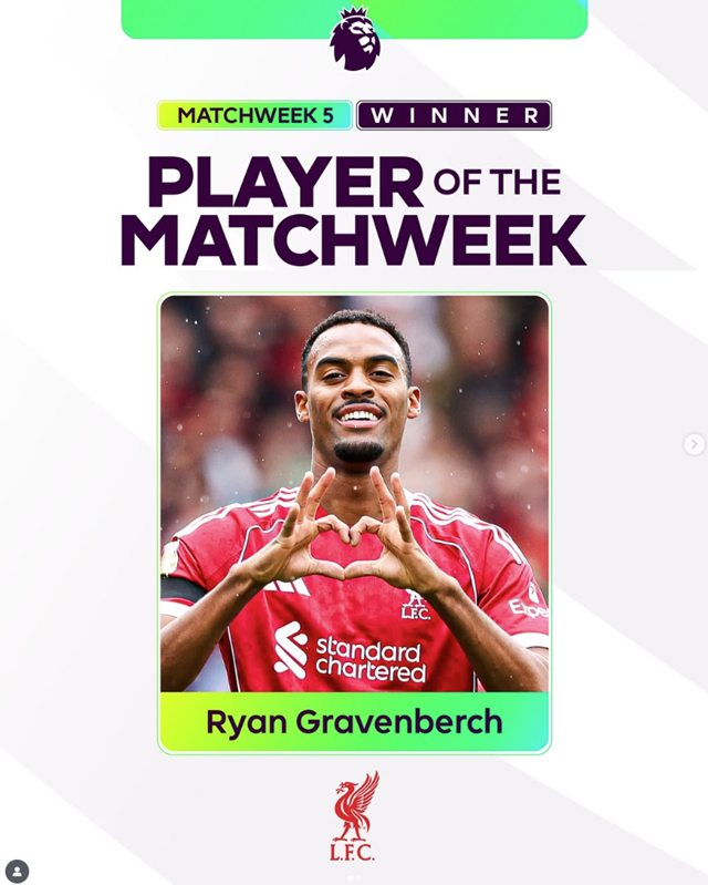 EPL 사무국은 23일(한국시간) 홈페이지 및 SNS를 통해 흐라번베르흐가 리그 5라운드에서 최고 활약을 펼친 선수에게 주어지는 '이주의 선수'에 선정됐다고 발표했다.