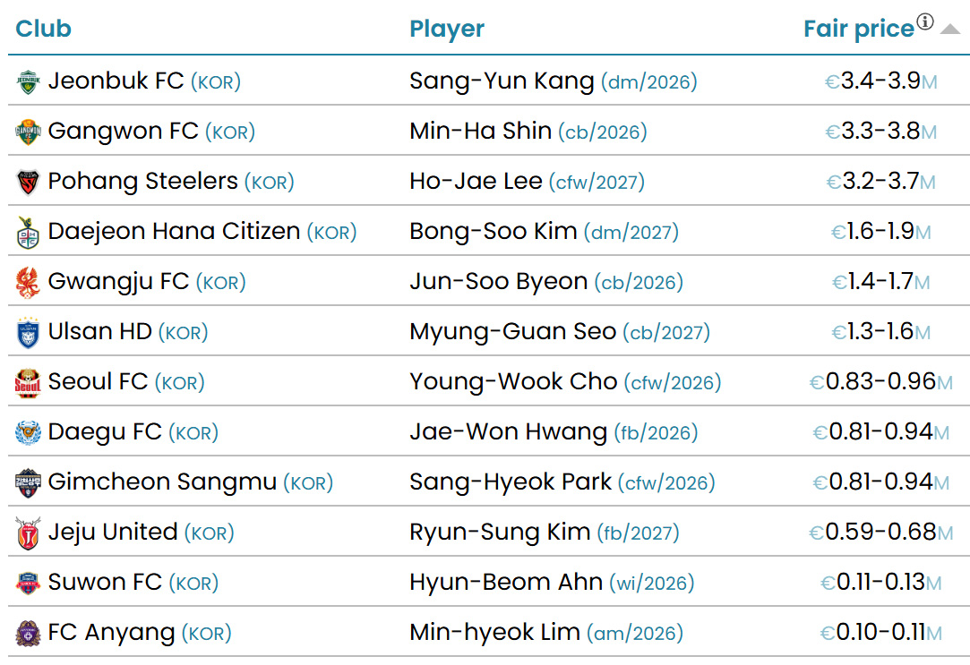 FC서울 조영욱(26)과 대구FC 황재원(23), 김천 상무 박상혁(23)이 그 뒤를 이었지만, 이들의 현재 시장가치는 100만 유로(약 16억 5000만원)를 밑돌았다. 제주 유나이티드 김륜성(23), 수원FC 안현범(31) 등도 순위권에 올랐다.