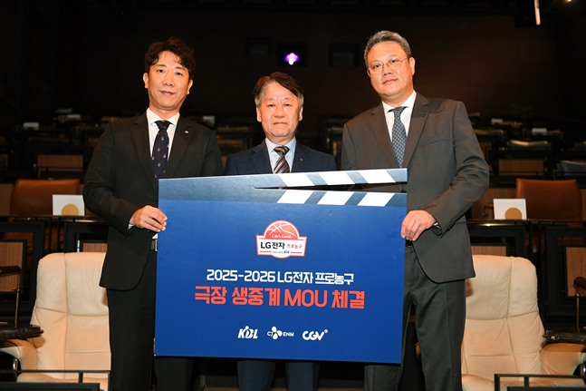 KBL이 30일 CJ ENM-CJ CGV와 2025-2026 LG전자 프로농구 주요 경기를 CGV 극장에서 생중계하기 위한 협력 관계를 구축하고자 업무협약(MOU)을 체결했다고 이날 밝혔다.