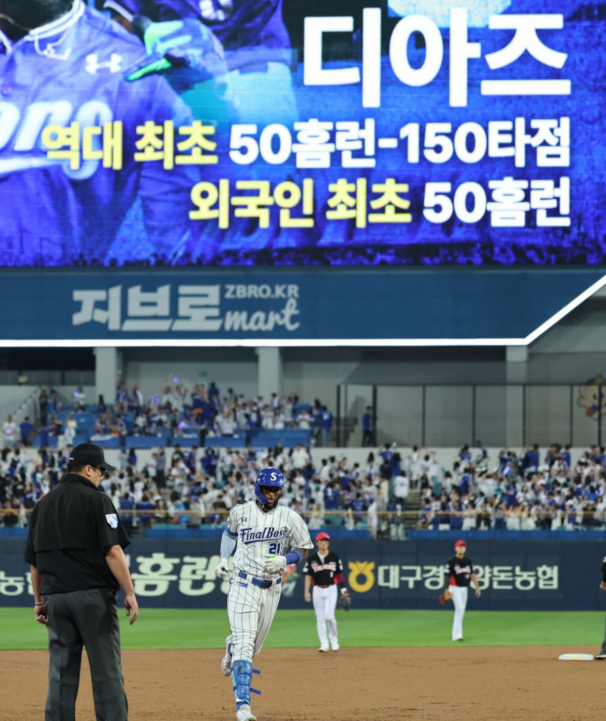 이번 시즌 디아즈의 50번째 홈런이었다. 디아즈는 KBO 리그 외국인 타자 최초로 한 시즌에 50홈런을 찍은 선수가 됐다. 앞서 50홈런 타자는 이승엽(1999, 2003년), 심정수(2003년), 박병호(2014~2015년)가 있었는데 디아즈가 4번째로 '50홈런' 클럽에 가입한 것이다. 디아즈는 5회말 안타까지 추가해 4타수 2안타(1홈런) 3타점으로 경기를 마쳤다. 이번 시즌 타율은 0.313이 됐고 타점은 무려 156개다. KBO 리그 역사에서 유일하게 50홈런, 150타점을 동시에 달성한 선수다.