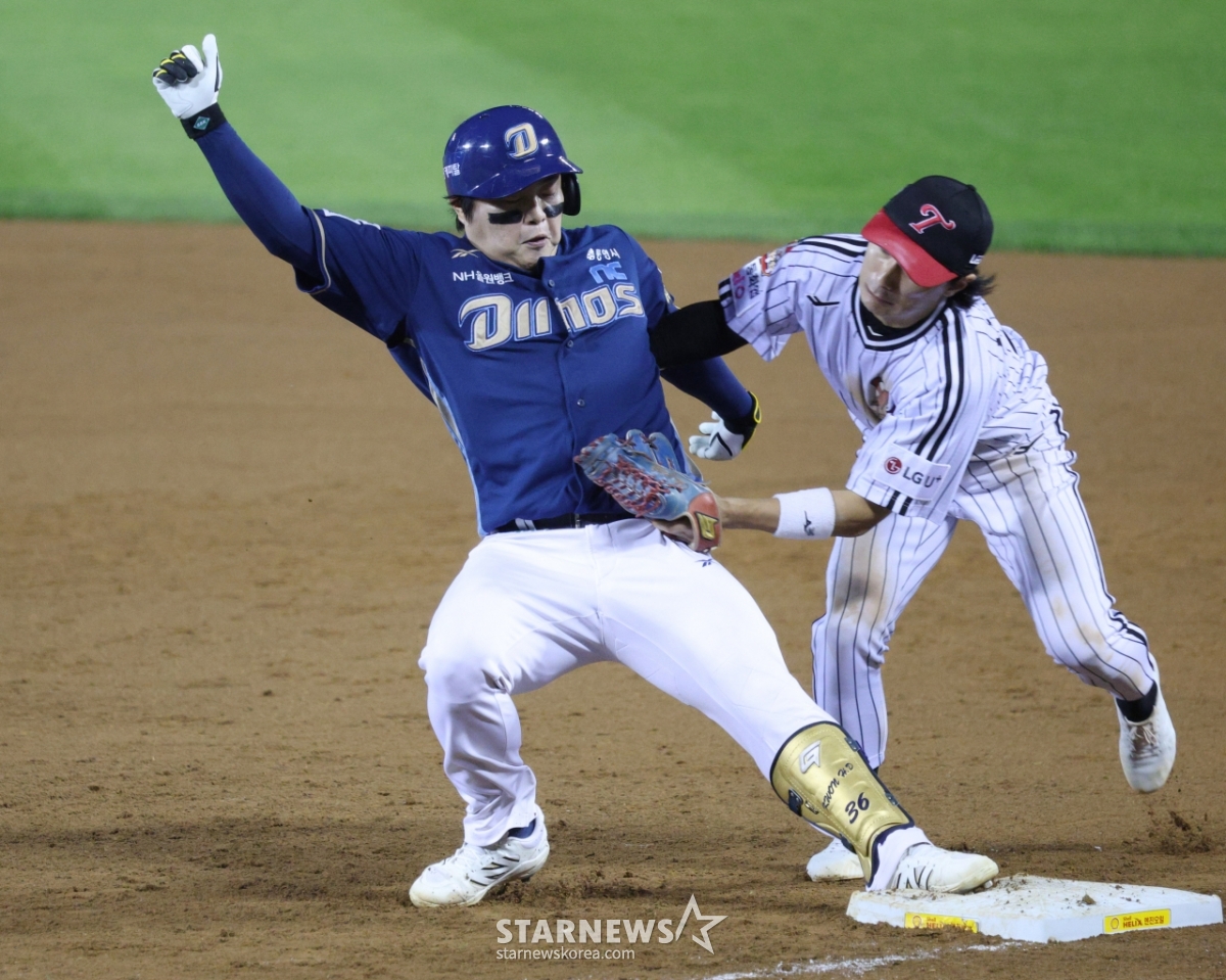 스포츠야구[포토] 권희동 '세리머니하다 사망할 뻔'발행 : 2025.10.01 ・ 21:29잠실=김진경 대기자광고삭제2025 신한 SOL Bank KBO리그 LG 트윈스 대 NC 다이노스 경기가 1일 서울 잠실야구장에서 열렸다.NC 권희동이 8회초 2사 2,3루에서 2타점 적시타를 날리고 출루한 후 세리머나를 하다 황급히 귀루하고 있다. 태그 시도하는 LG 2루수는 신민재.<저작권자 © 스타뉴스, 무단전재 및 재배포 금지>프로야구KBOLG_트윈스우승1위염갈량추천 기사김진경 대기자기자홈좋아요 스포츠-야구의 인기 급상승 뉴스스포츠-야구의 최신 뉴스