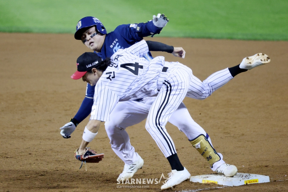 스포츠야구[포토] 신민재 '때론 치열하게'발행 : 2025.10.01 ・ 21:33잠실=김진경 대기자광고삭제2025 신한 SOL Bank KBO리그 LG 트윈스 대 NC 다이노스 경기가 1일 서울 잠실야구장에서 열렸다.NC 권희동이 8회초 2사 2,3루에서 2타점 적시타를 날리고 출루한 후 세리머나를 하다 황급히 귀루하고 있다. 태그 시도하는 LG 2루수는 신민재.<저작권자 © 스타뉴스, 무단전재 및 재배포 금지>프로야구KBOLG_트윈스우승1위염갈량추천 기사김진경 대기자기자홈좋아요 스포츠-야구의 인기 급상승 뉴스스포츠-야구의 최신 뉴스