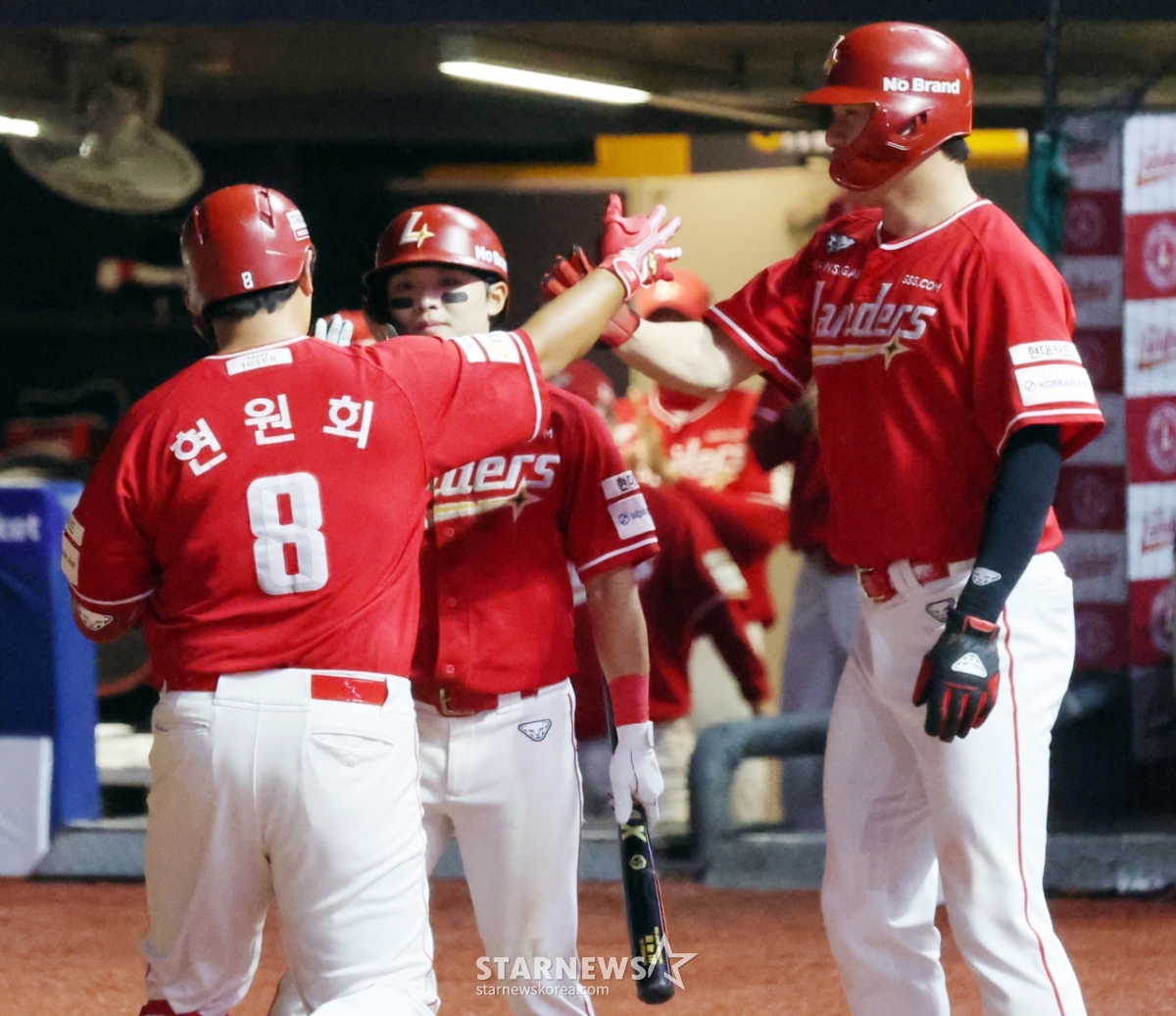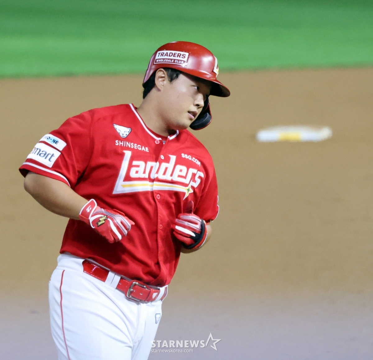 SSG 7번타자 현원희가 1일 랜더스필드에서 열린 2025KBO리그 한화이글스와 SSG랜더스 경기 9회말 2사 1루에서 한화 마무리 김서현을 상대로 투런홈런을 터트린 후 홈인하고 있다. 2025.10.01