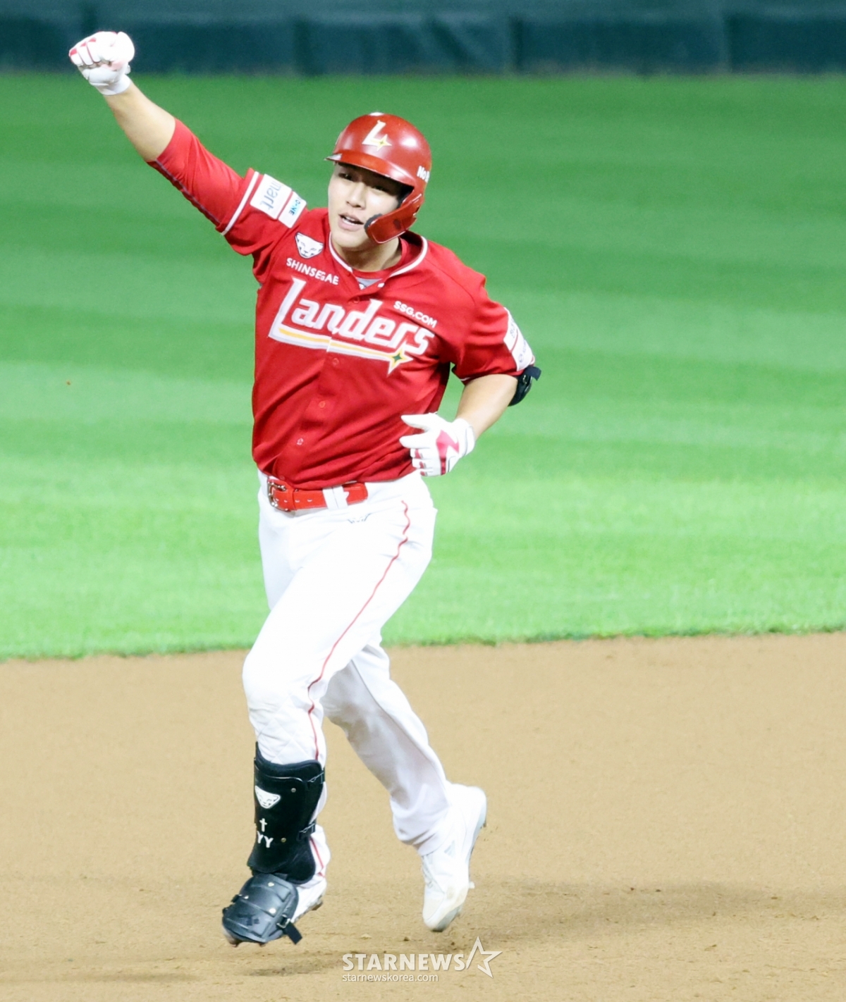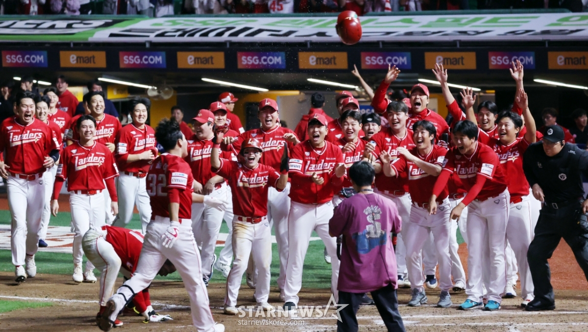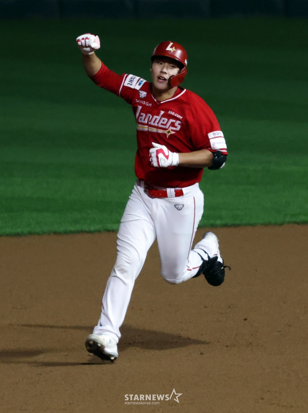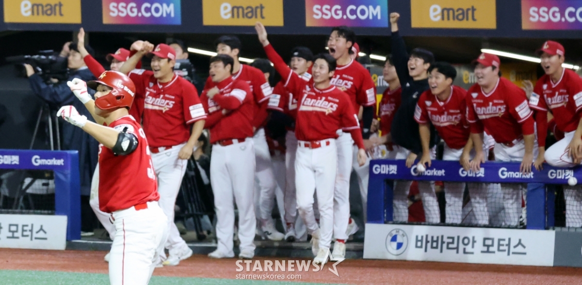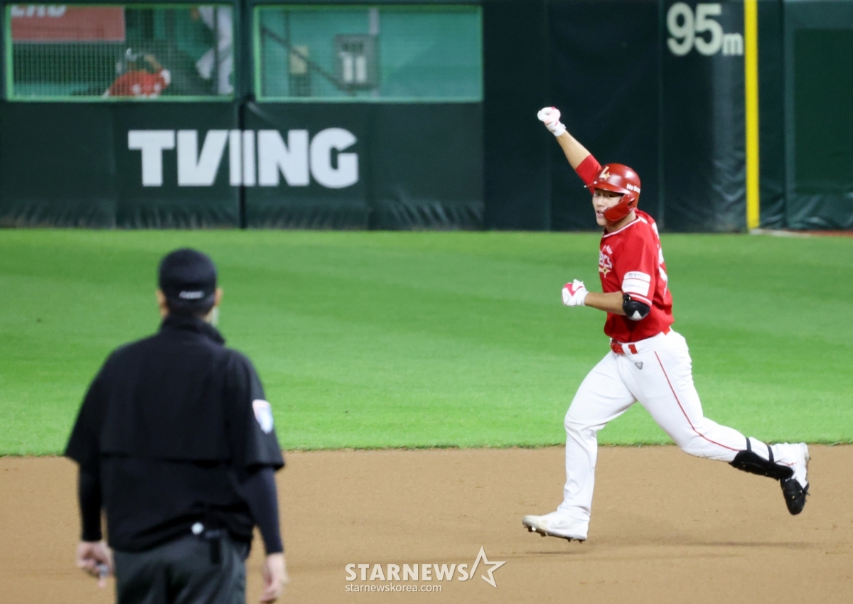 (SSG 9번타자 이율예가 1일 랜더스필드에서 열린 2025KBO리그 한화이글스와 SSG랜더스 경기 9회말 2사 1루에서 한화 마무리 김서현을 상대로 끝내기 투런홈런을 터트린 후 환호하고 있다. LG트윈스는 이율예의 홈런으로 남은 한화경기에 상관없이 리그1위를 확정지었다. 2025.10.01)