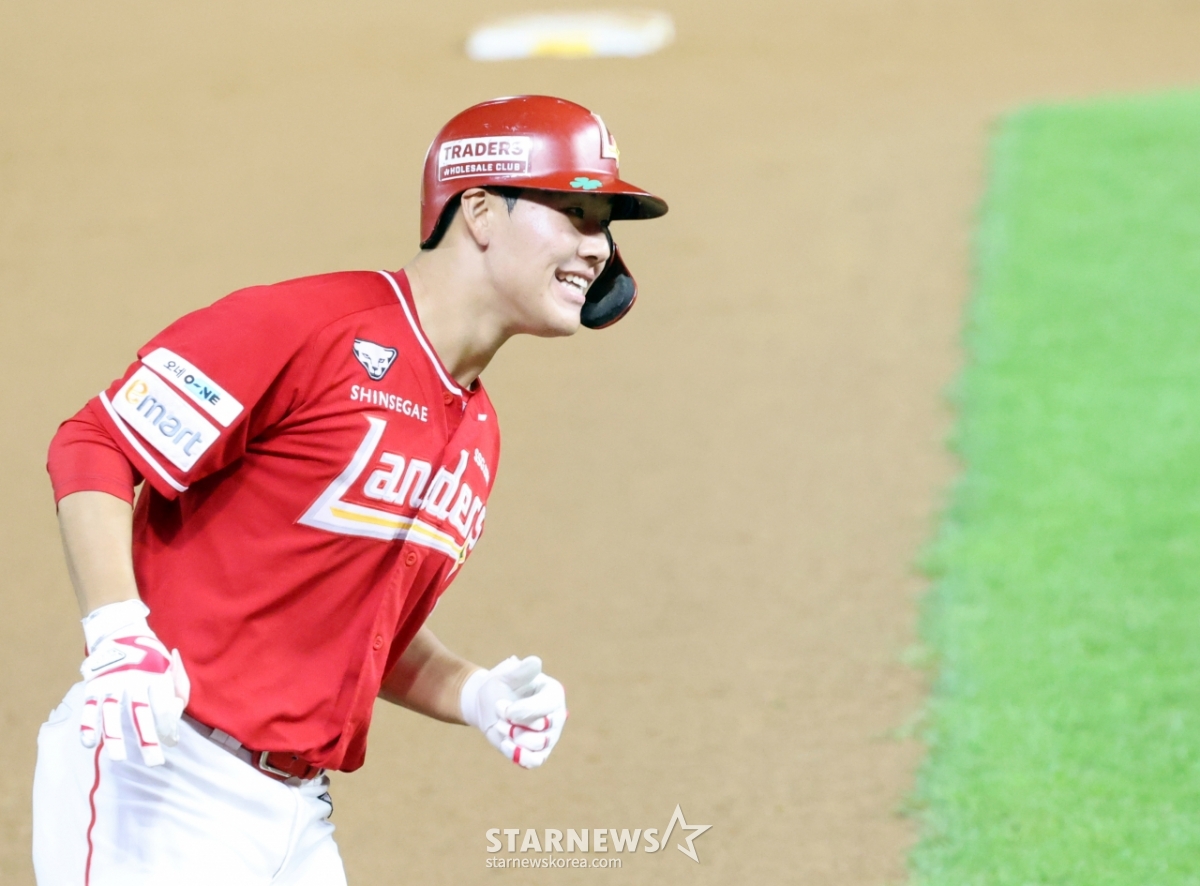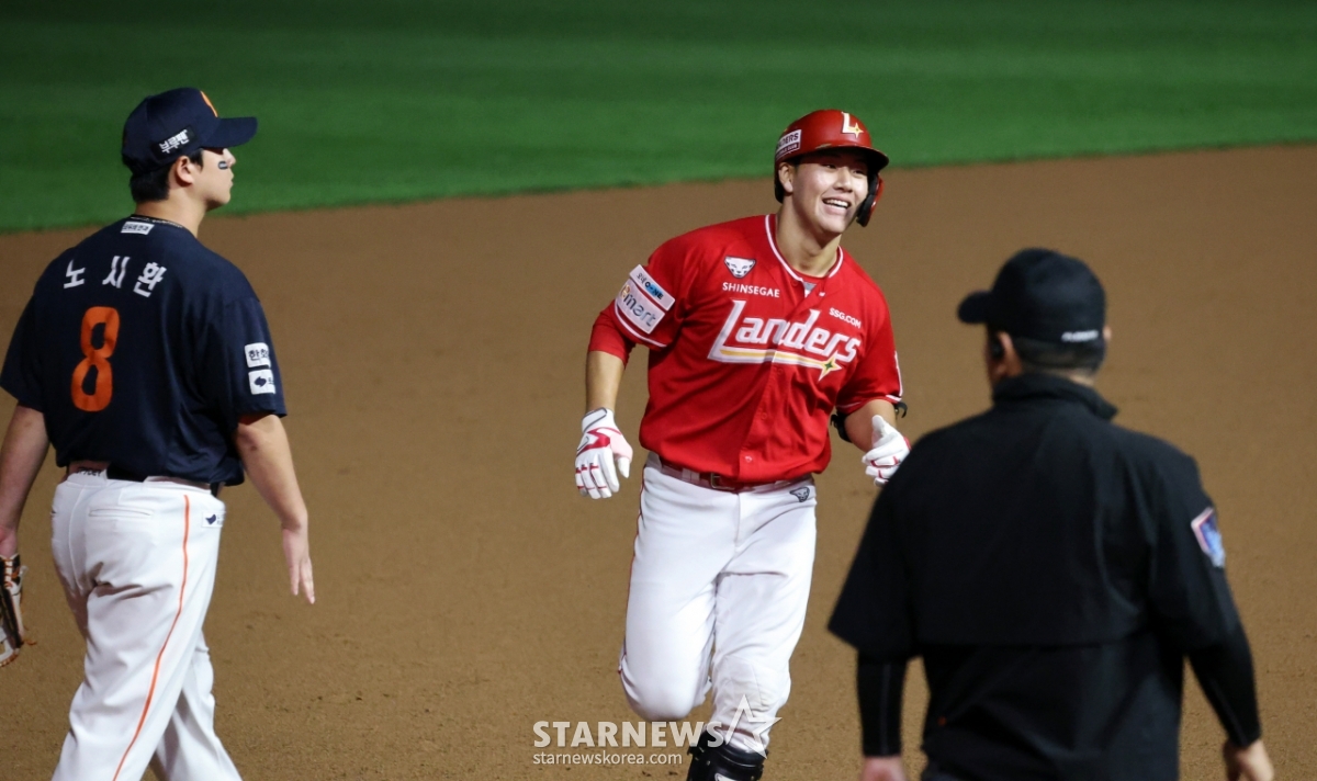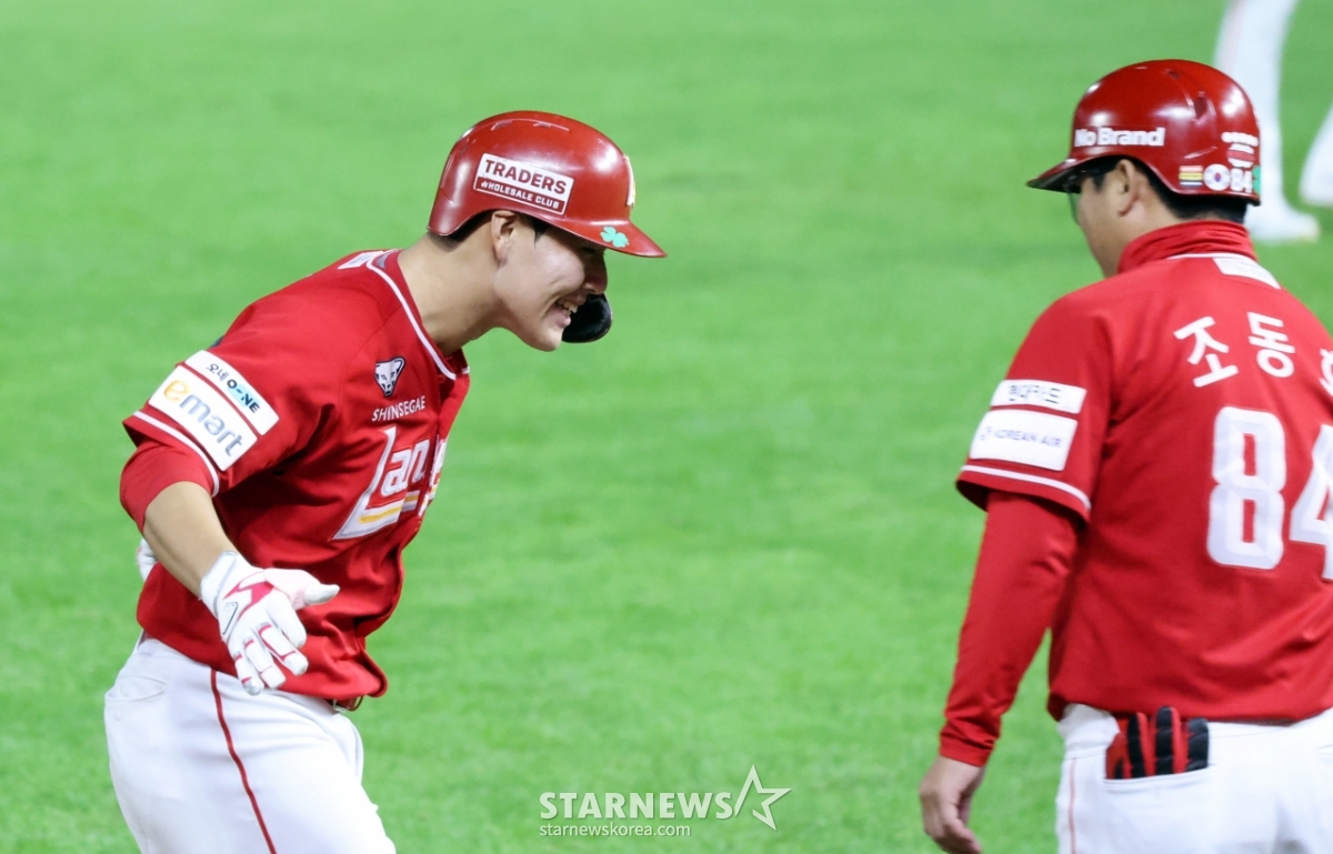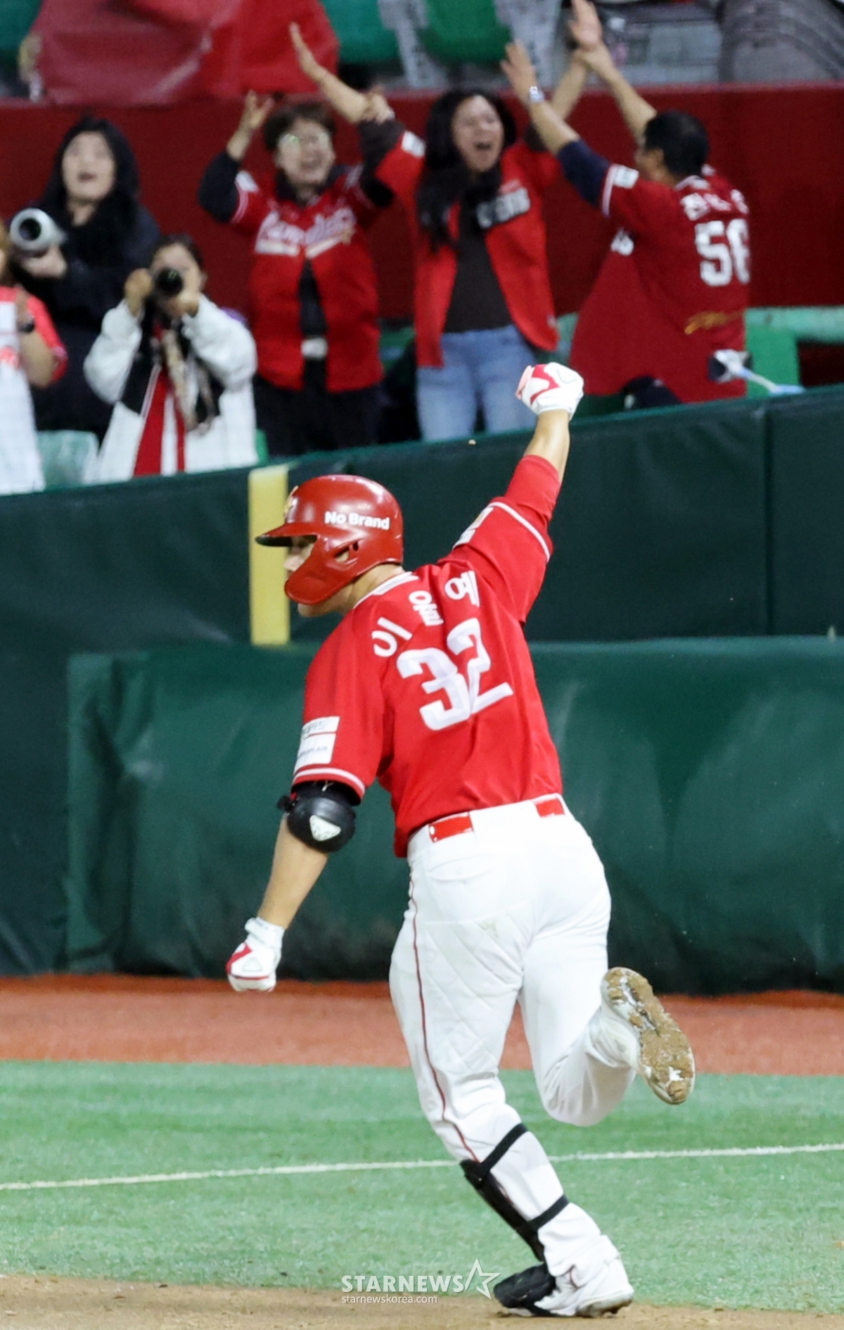(SSG 9번타자 이율예가 1일 랜더스필드에서 열린 2025KBO리그 한화이글스와 SSG랜더스 경기 9회말 2사 1루에서 한화 마무리 김서현을 상대로 끝내기 투런홈런을 터트린 후 환호하고 있다. LG트윈스는 이율예의 홈런으로 남은 한화경기에 상관없이 리그1위를 확정지었다. 2025.10.01)