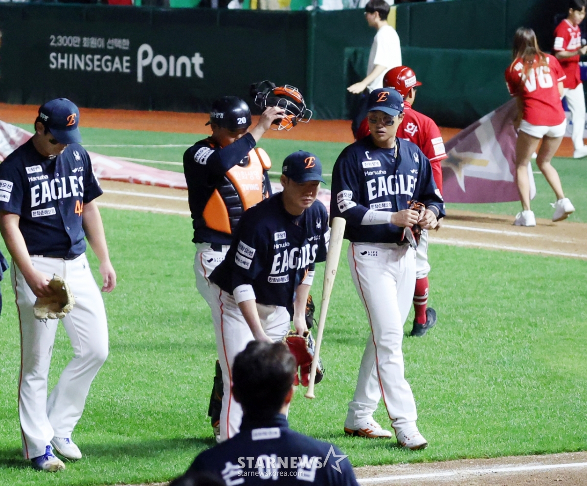 그라운드에서 철수하던 하주석이 '독수리와 팬들을 울린' 이예율의 방망이를 줏어 든다.
