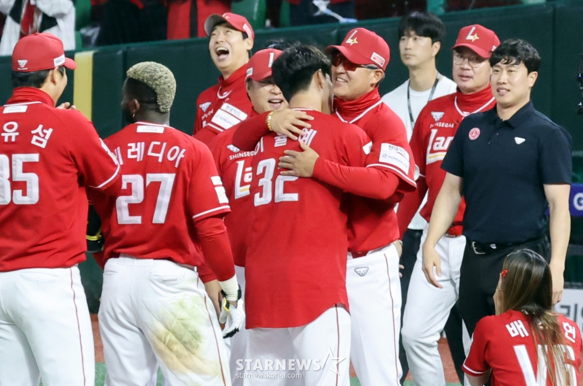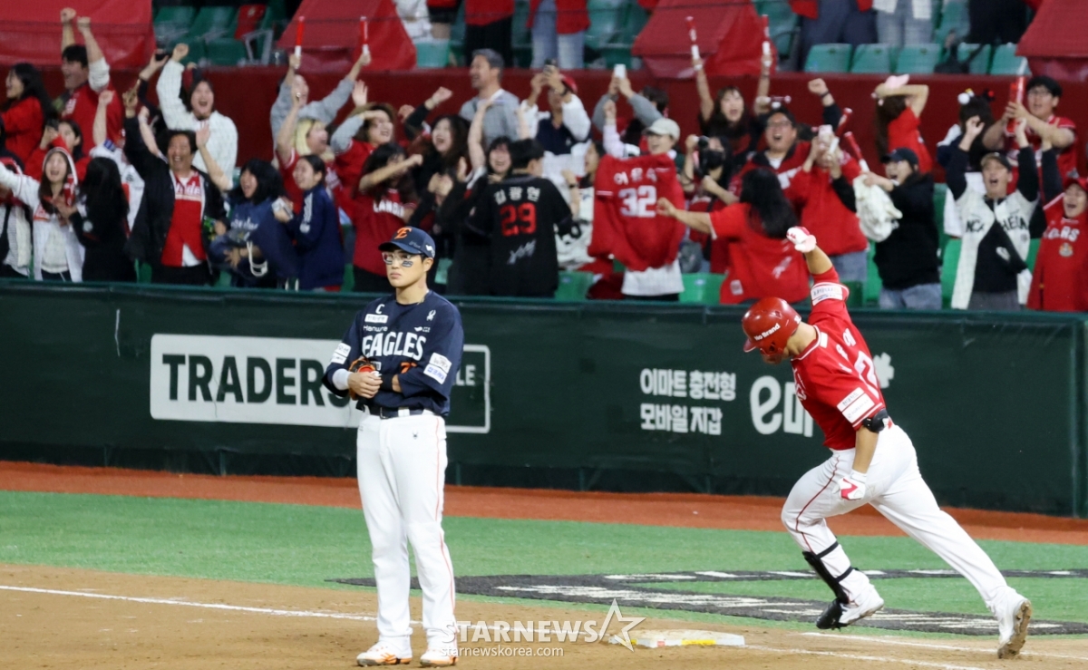 좌측담장을 넘어가는 끝내기 투런홈런이다. 고개를 떨군 투수는 한화의 마무리 김서현이었다.