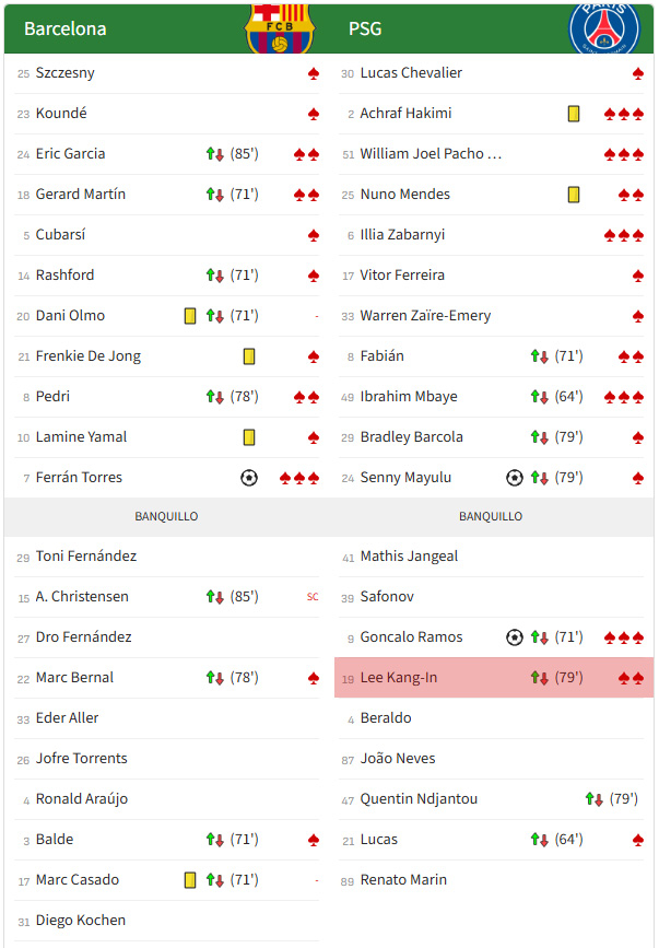 이강인은 2일(한국시간) 스페인 바르셀로나의 에스타디 올림픽 류이스 쿰파니스에서 열린 2025~2026 유럽축구연맹(UEFA) 챔피언스리그(UCL) 리그 페이즈 2차전 바르셀로나전 직후 스페인 매체 아스로부터 스페이드(♠) 2개의 평점을 받았다.