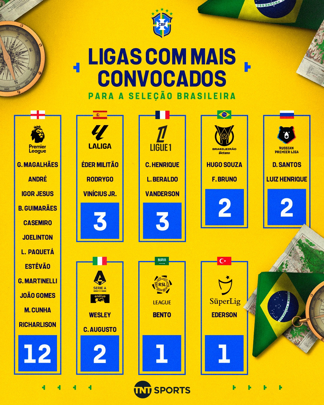 EPL 무대를 누비는 선수들 중에서는 손흥민(로스앤젤레스FC)의 토트넘 시절 동료인 히샬리송을 비롯해 카세미루, 마테우스 쿠냐(이상 맨체스터 유나이티드), 가브리엘 마갈량이스, 가브리엘 마르티넬리(이상 아스날), 이스테방(첼시) 등이 이름을 올렸다.