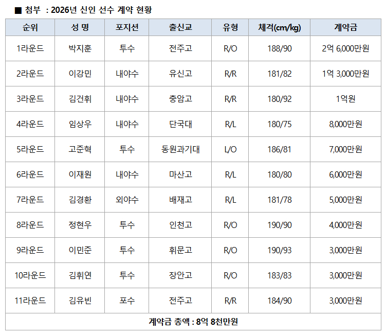 먼저 KT는 1라운드 지명을 받은 전주고 투수 박지훈과 계약금 2억 6000만원에 계약했다. 또 2라운드 유신고 내야수 이강민(18)과 1억 3000만원에 도장을 찍었다.