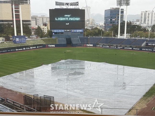 3일 SSG 랜더스-NC 다이노스의 경기가 열릴 예정이던 창원NC파크에 대형 방수포가 깔렸다. /사진=양정웅 기자