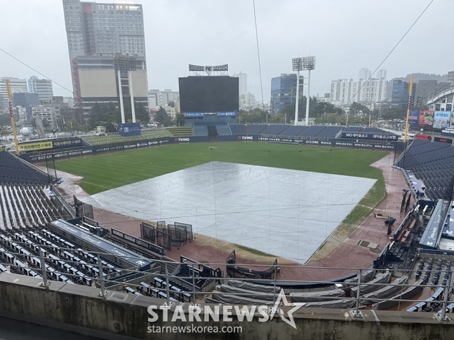 다만 비가 변수다. 이날 창원 지역에는 새벽부터 비가 내리고 있었고, 기상청 예보 상으로도 하루 종일 비가 올 전망이다. 이미 외야 워닝트랙은 물바다가 됐고, 그라운드에는 대형 방수포가 깔렸다. 만약 경기를 한다고 해도 정비 시간이 길어질 전망이다. 이에 우선 오후 2시경 1차 판단을 할 예정이다.